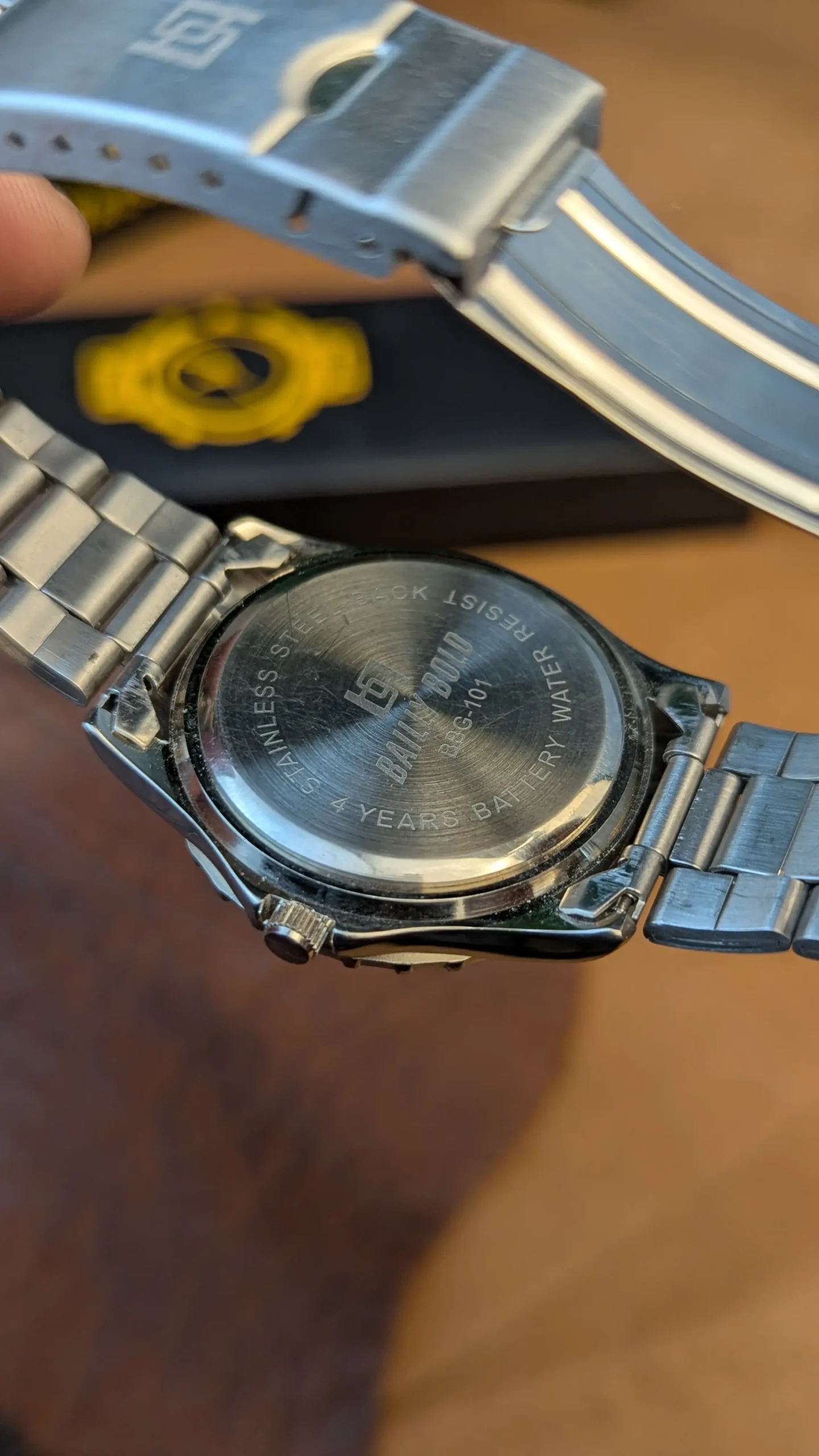 Powered by a reliable quartz movement, the watch ensures accurate timekeeping with minimal maintenance. The case back is marked with important specifications, including stainless steel construction, water resistance, and a long-lasting battery system.