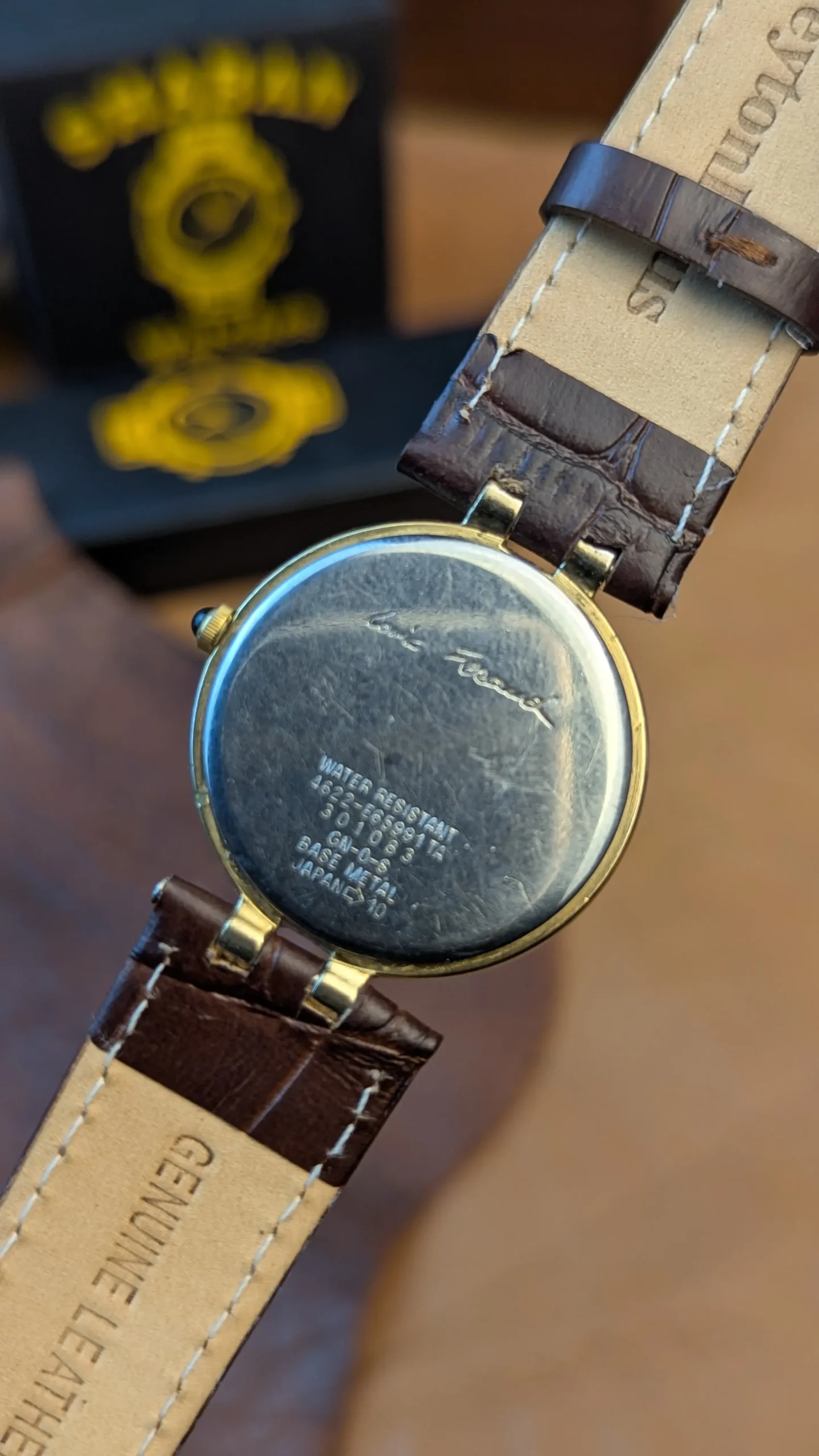 The watch is powered by a quartz movement, ensuring reliable and accurate timekeeping with low maintenance. The case back is marked water-resistant and has a base-metal bezel with a stainless-steel back.