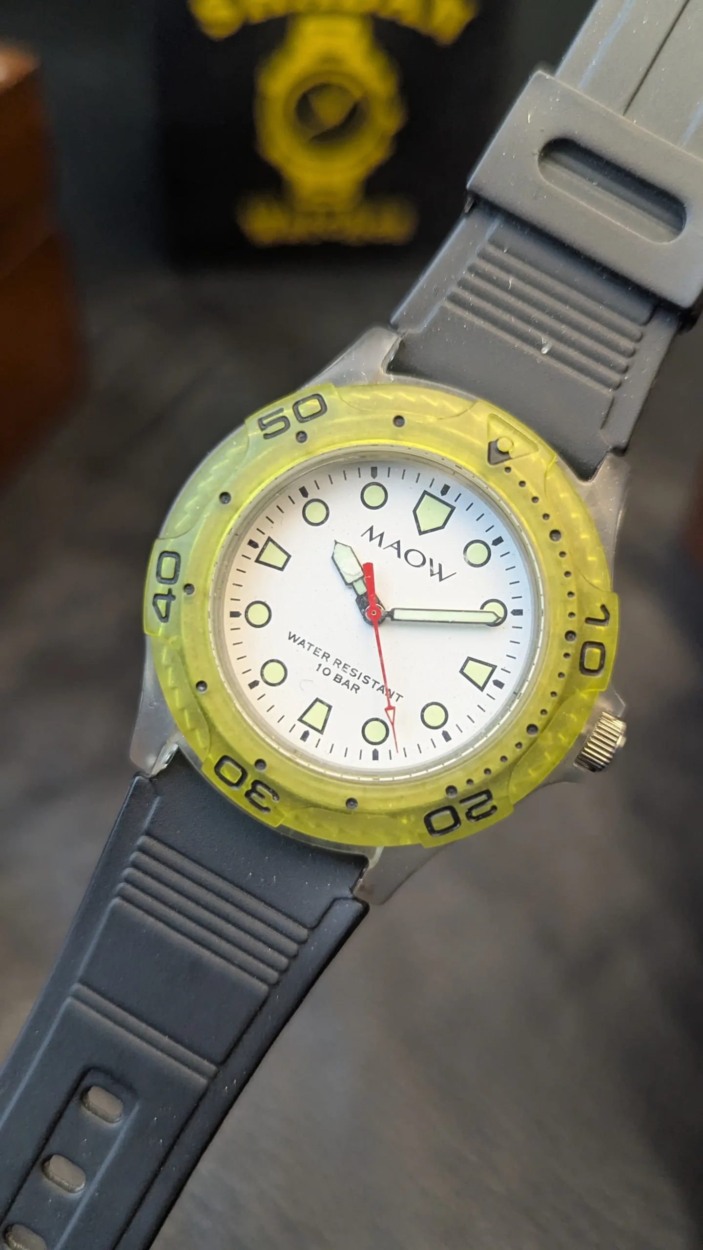 MAOW sports watchMAOW Sports Watch – White Dial, Yellow Bezel, Rubber Strap, 10 BAR Water Resistant, Quartz (Pre-Owned)