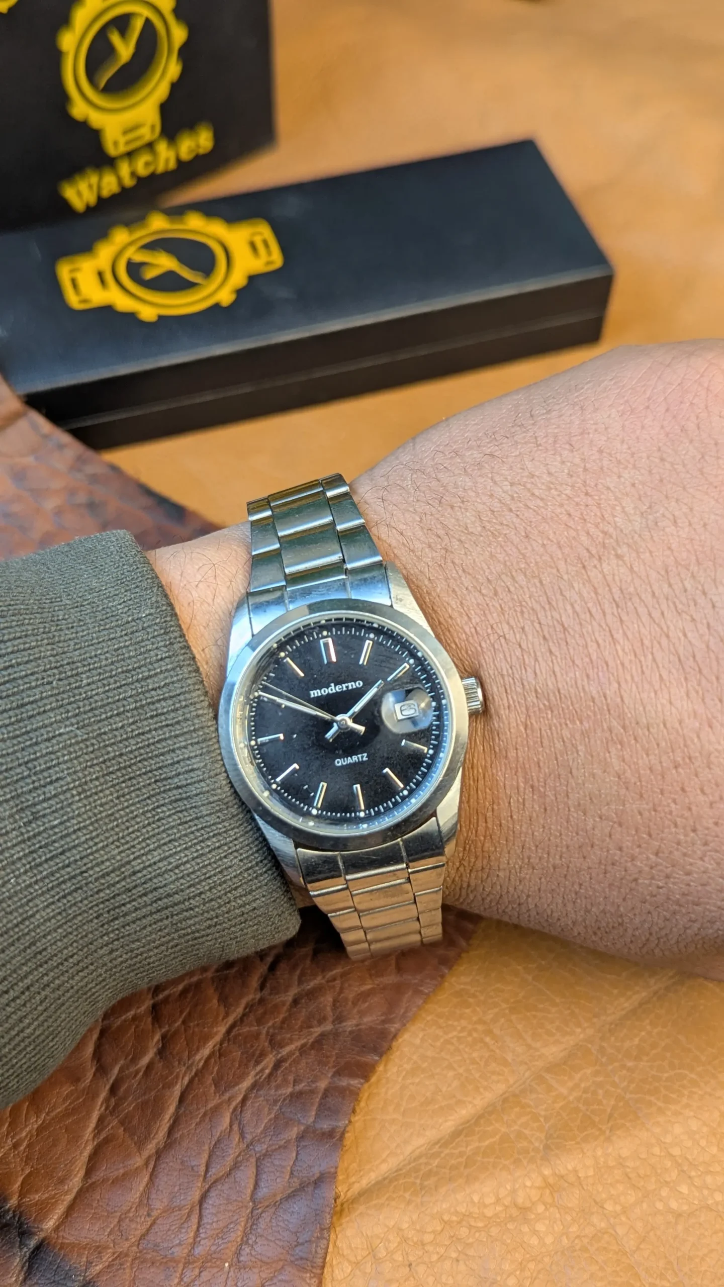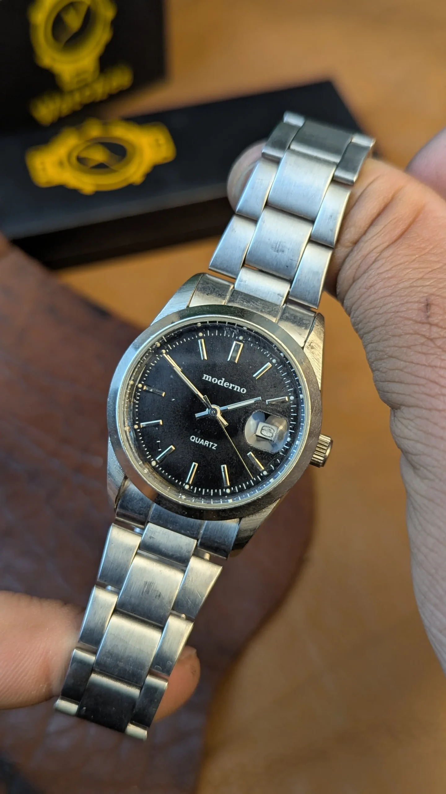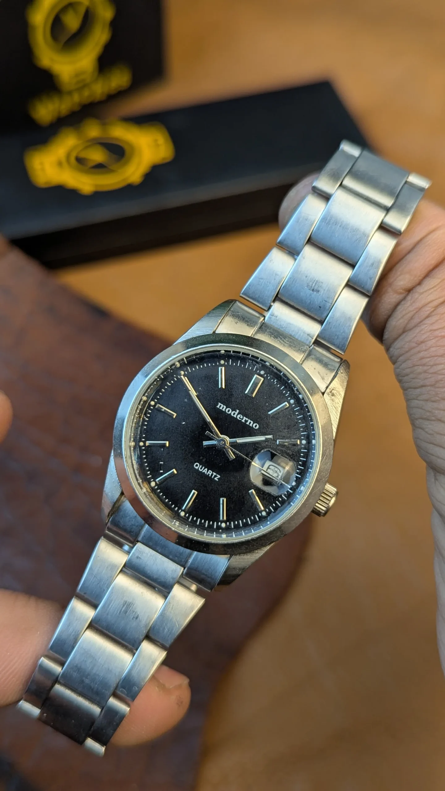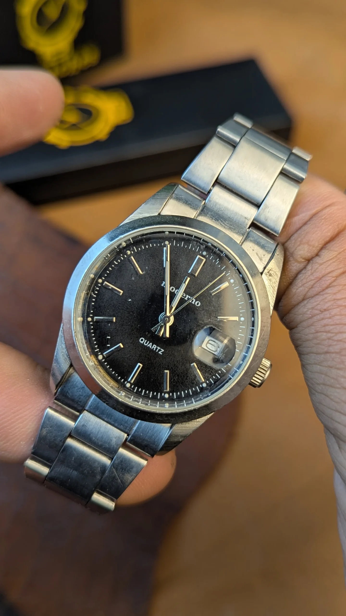 Classic Moderno quartz stainless steel watch featuring a black dial with date display at 3 o’clock. Reliable quartz movement, stainless steel case and bracelet, water-resistant back. Elegant everyday timepiece in pre-owned condition.