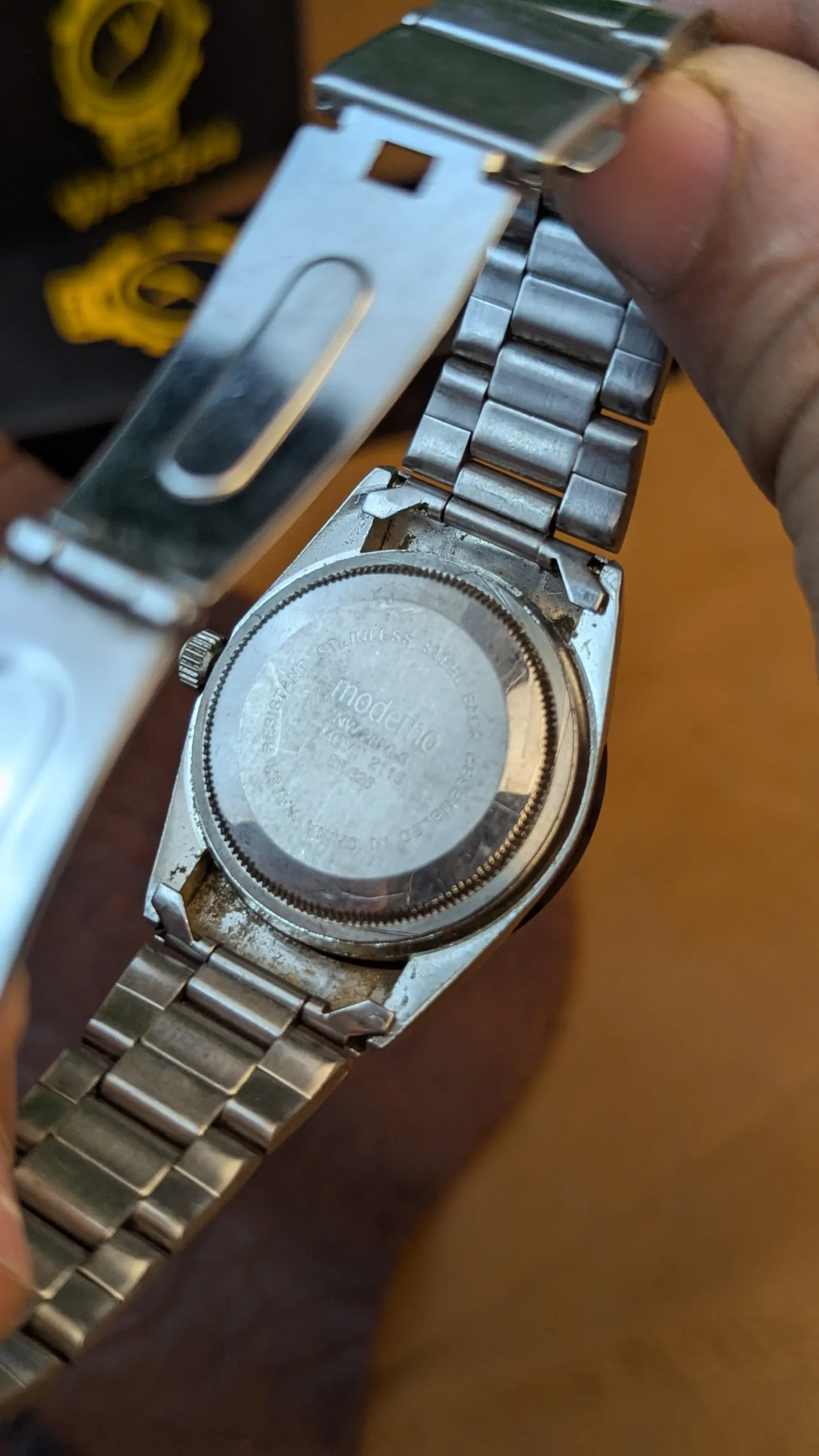 Built with a stainless steel case and bracelet, the watch provides durability and a comfortable wrist fit. The case back engraving indicates stainless steel construction and water resistance, making it suitable for regular use.
