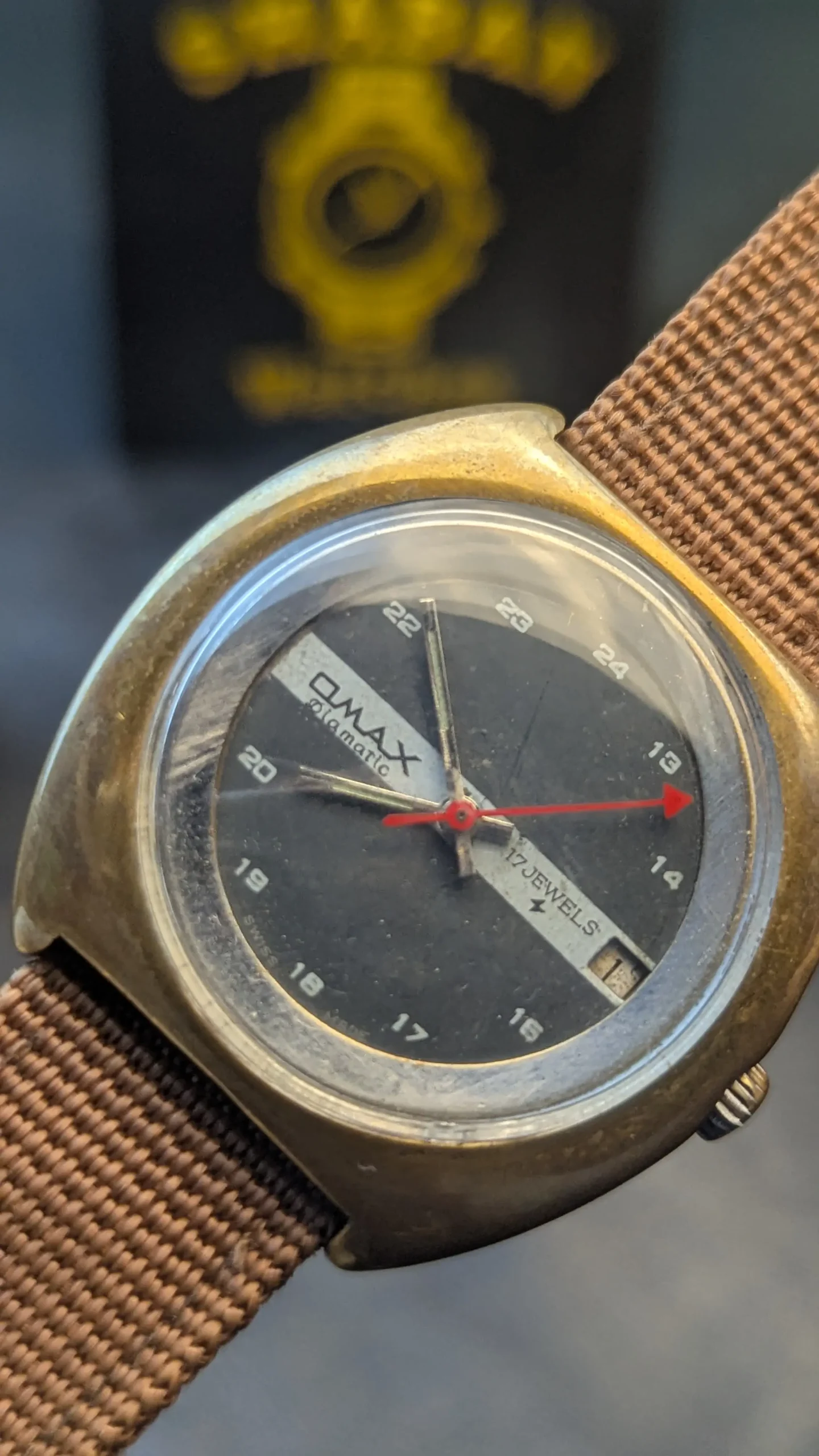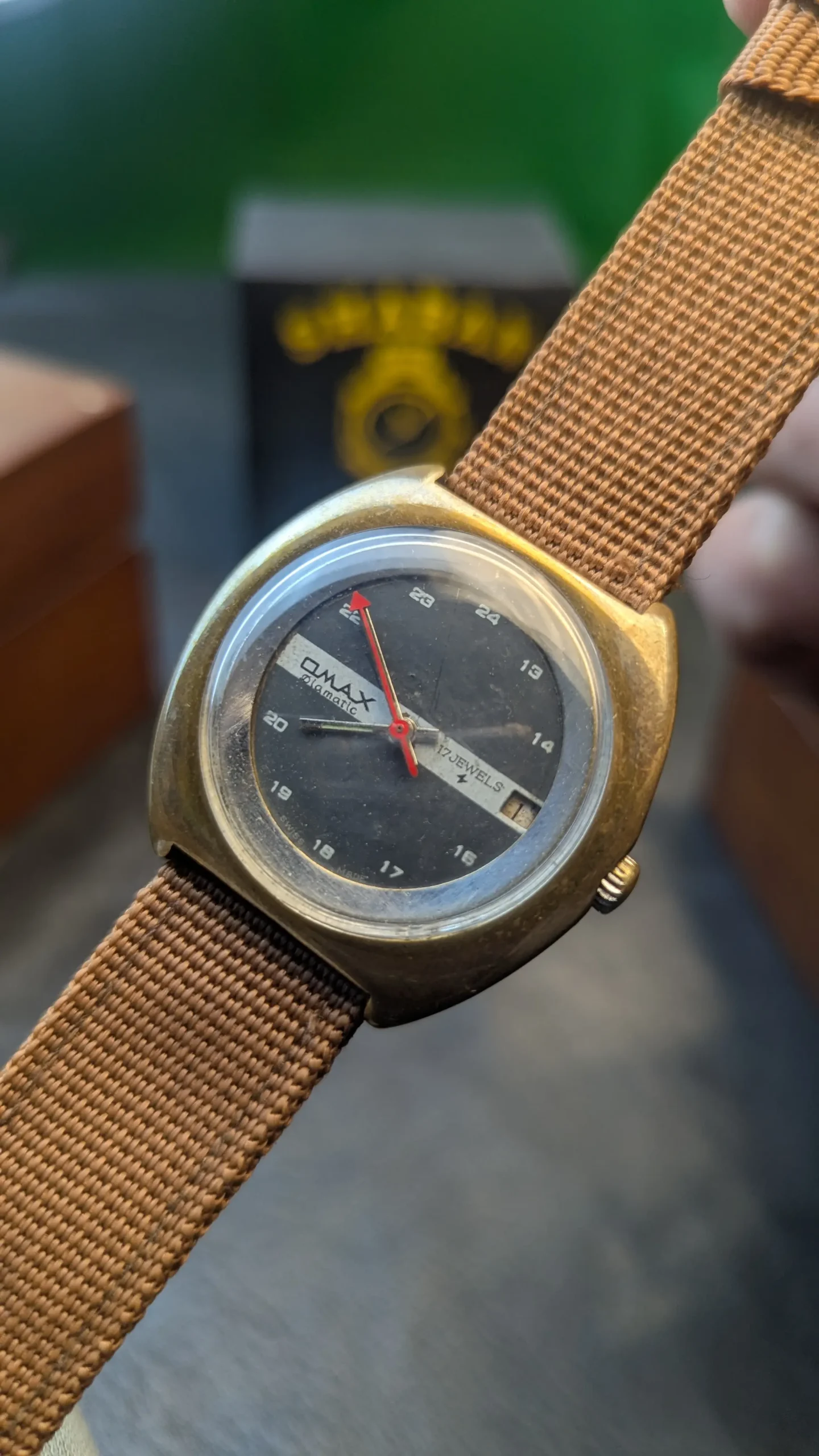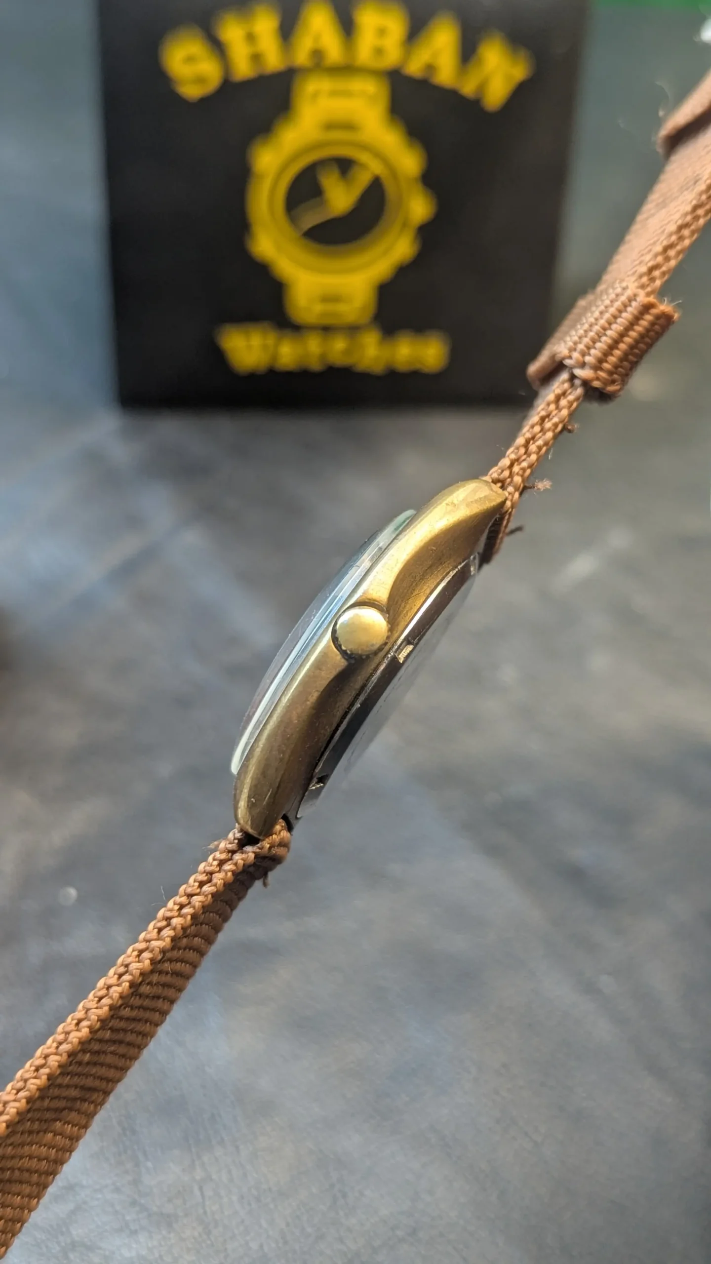 This is a pre-owned vintage watch. Signs of age and wear are visible, especially on the brass case. The watch is working well. Avoid water exposure and store in a dry place to maintain condition.