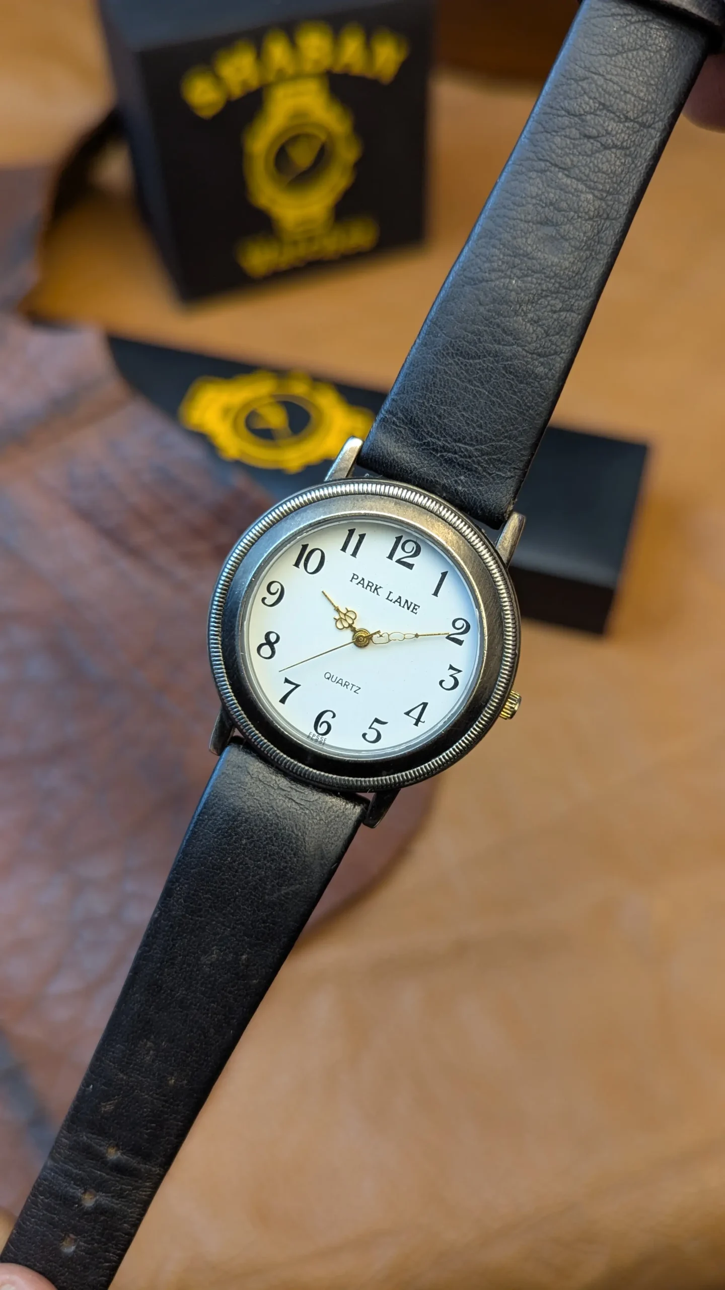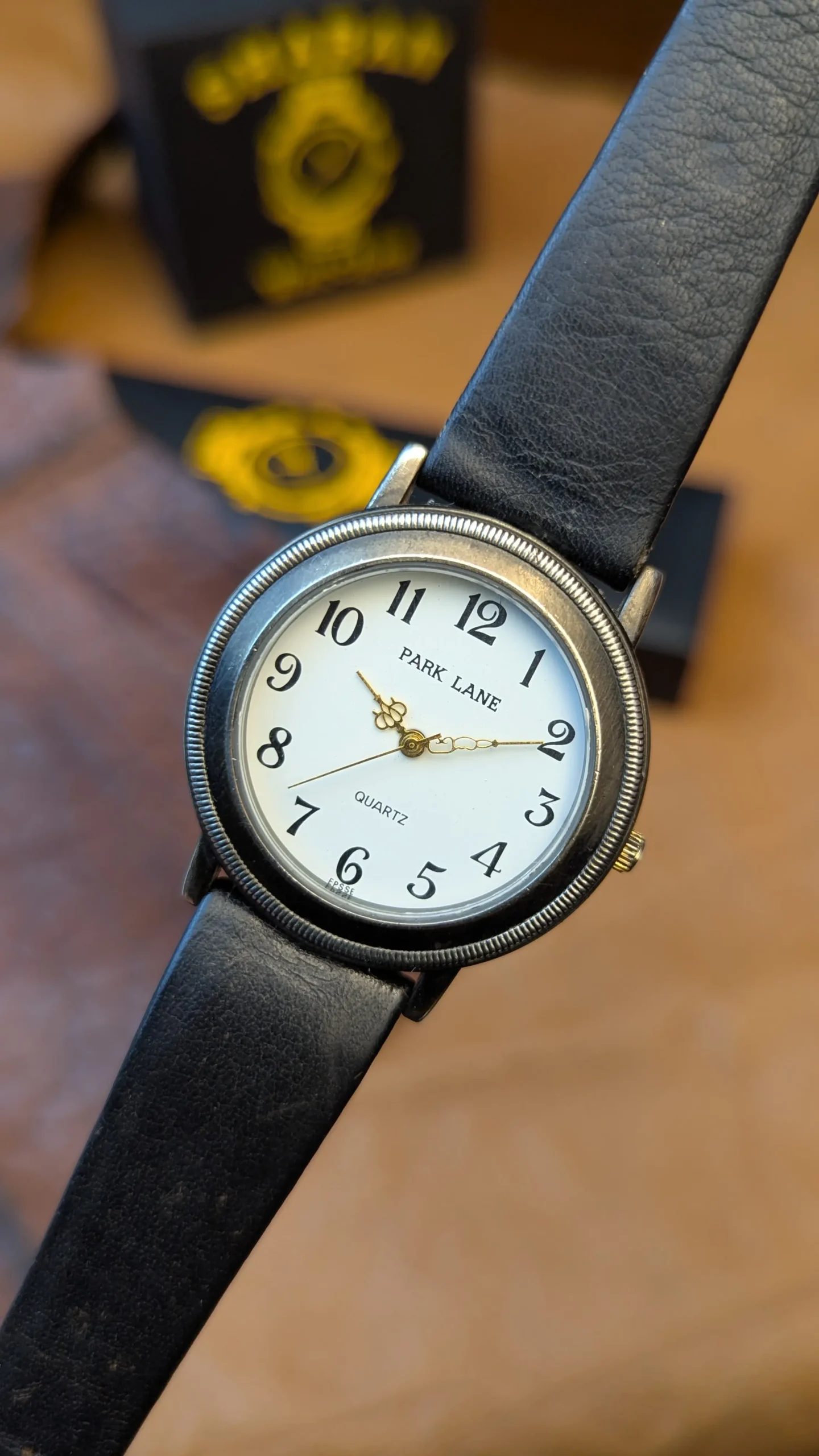 Elegant Park Lane quartz wristwatch featuring a clean white dial with Arabic numerals, decorative gold-tone hands, and a black leather strap. A simple and timeless everyday watch.