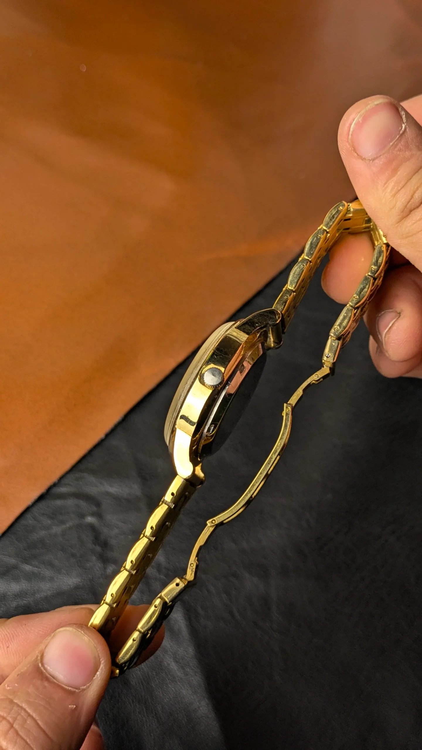 The stainless steel back and solid bracelet provide durability, while the gold-tone finish gives it a rich, classy presence on the wrist.