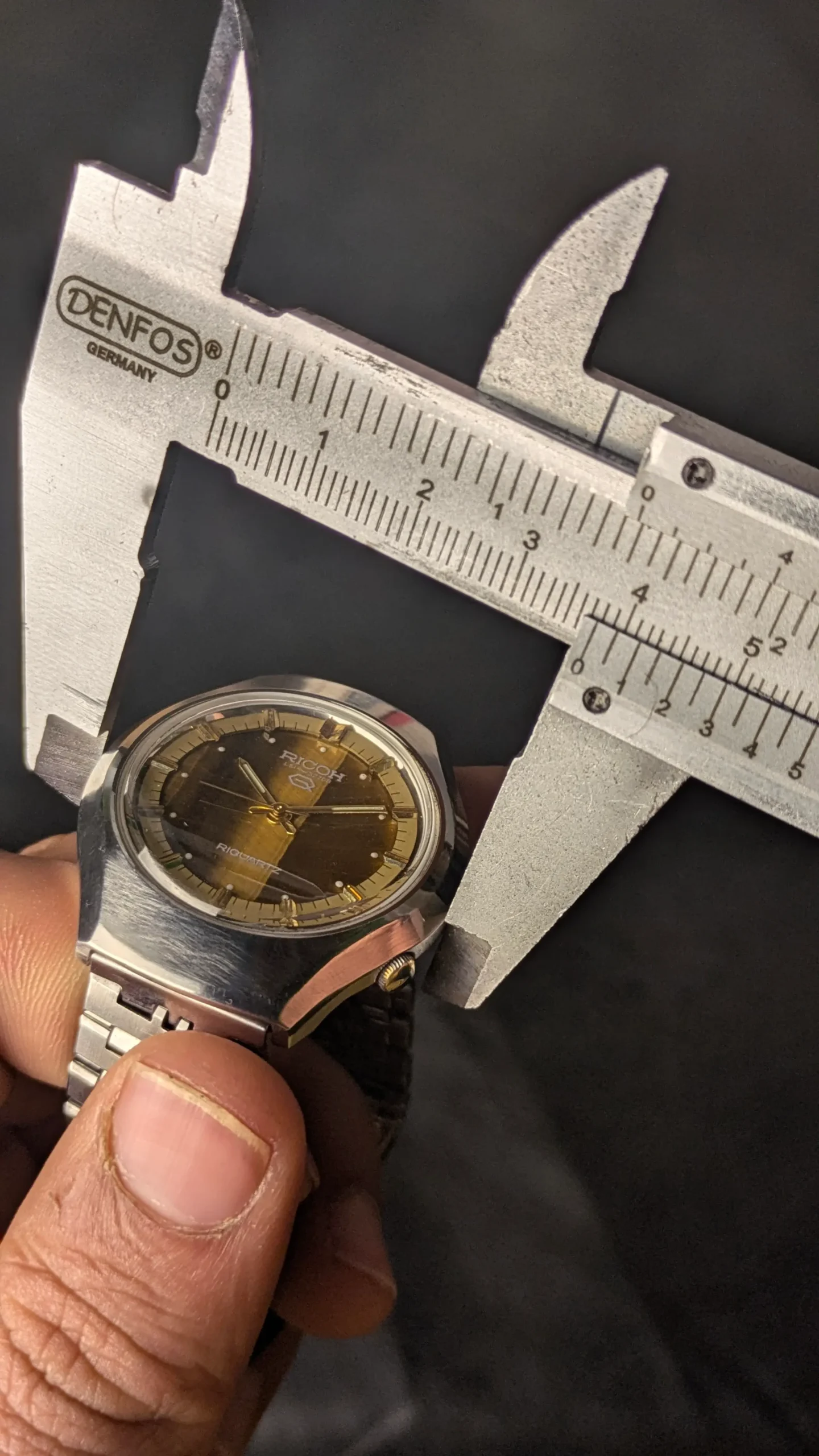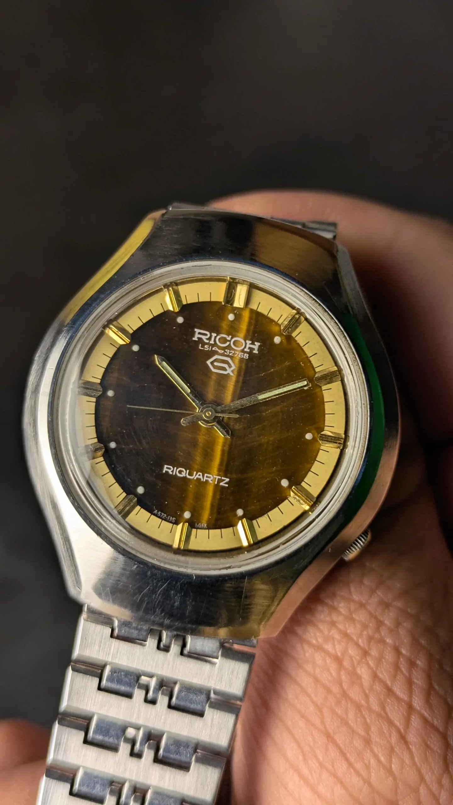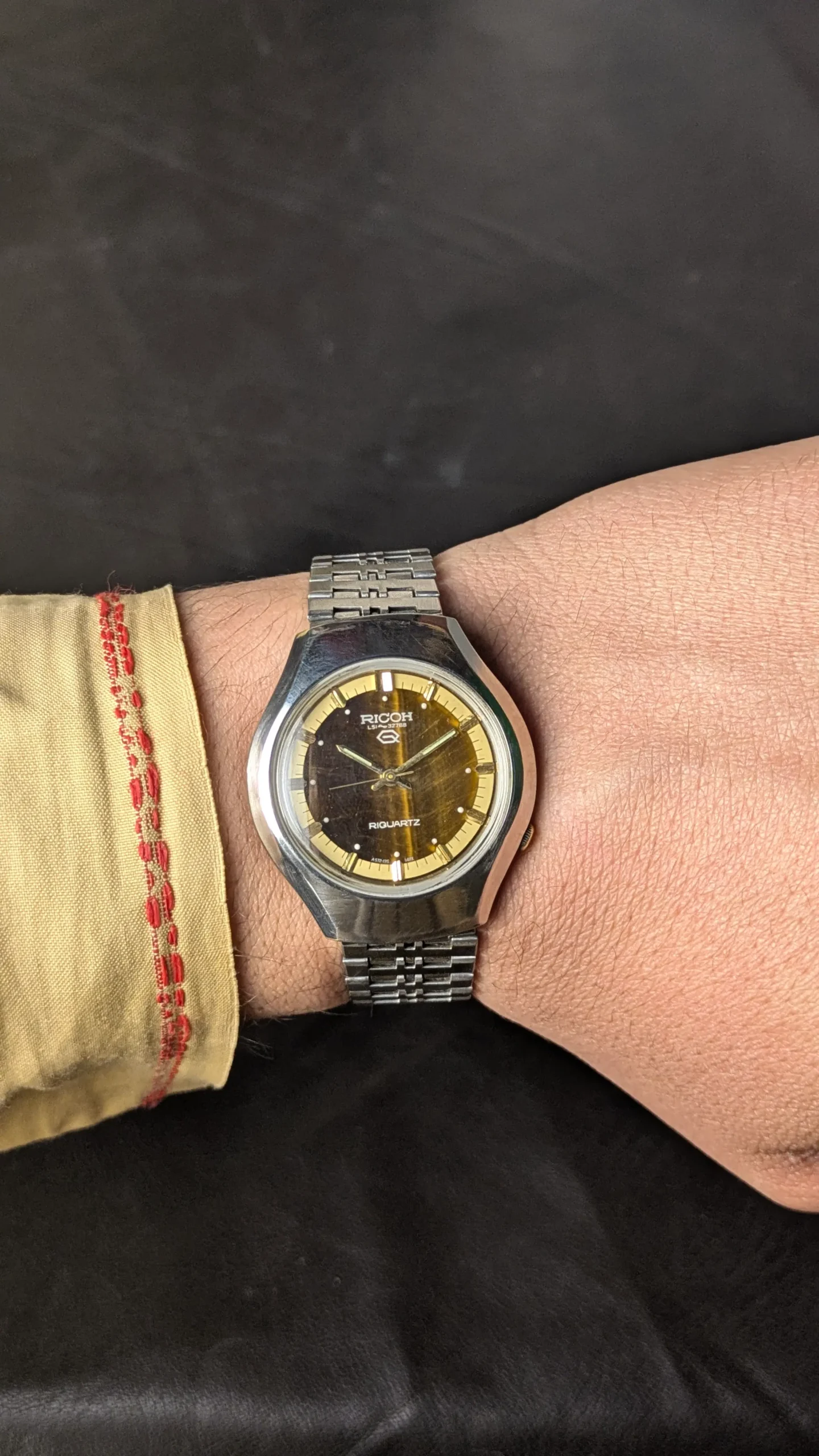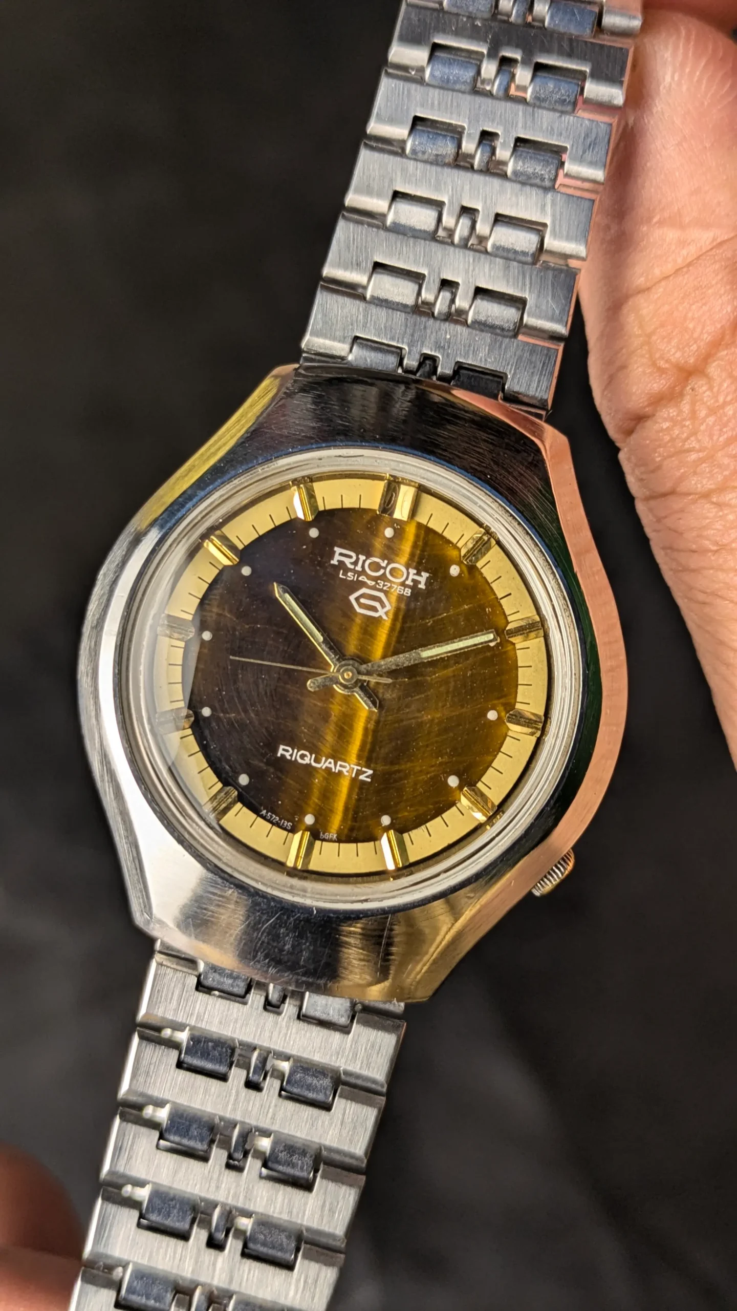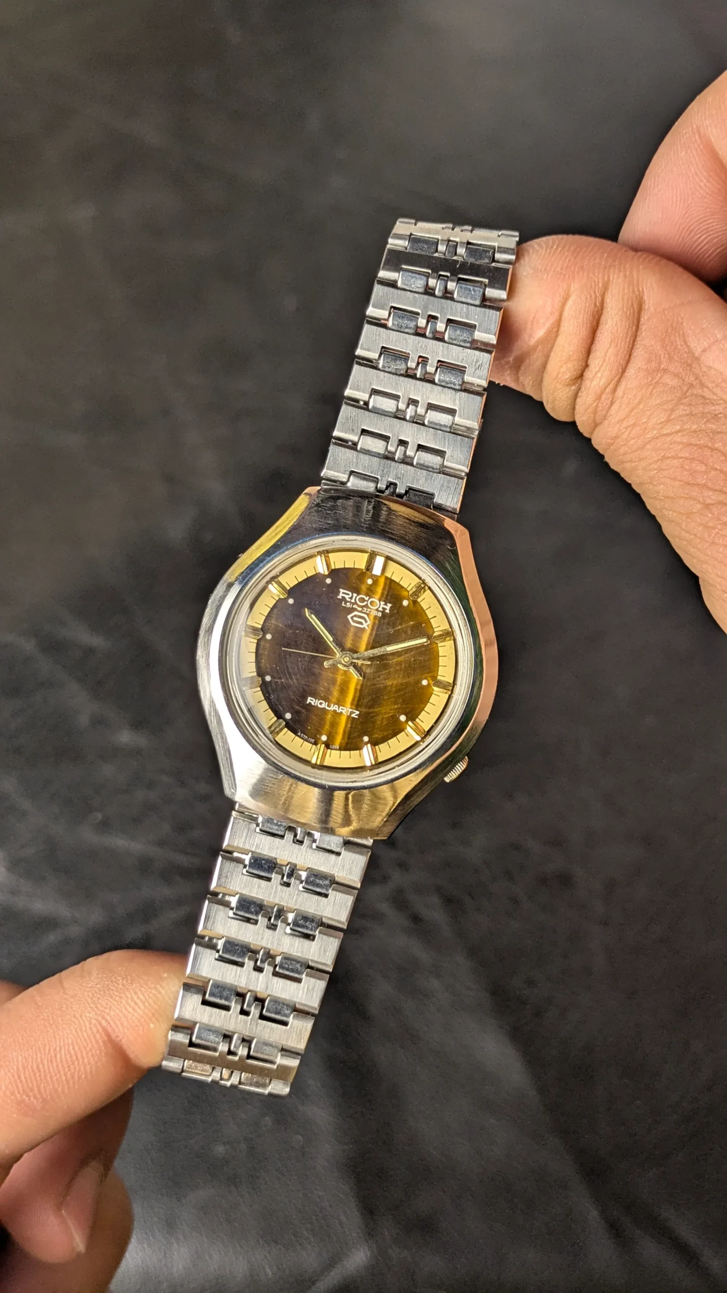 This Ricoh Riquartz vintage wristwatch stands out due to its beautiful Tiger Eye stone dial. Tiger eye is a natural gemstone known for its golden-brown color and shimmering effect that changes with light.