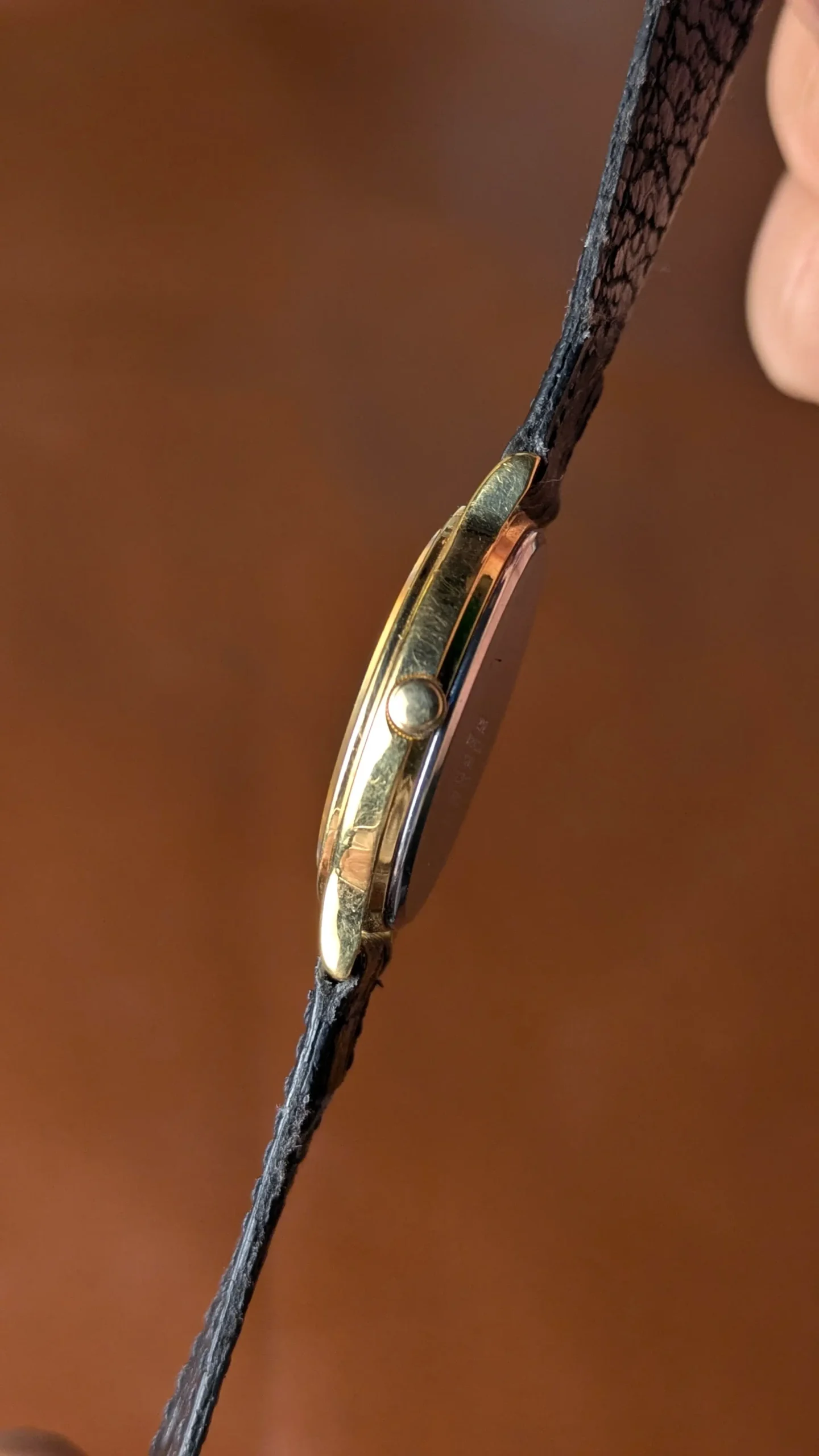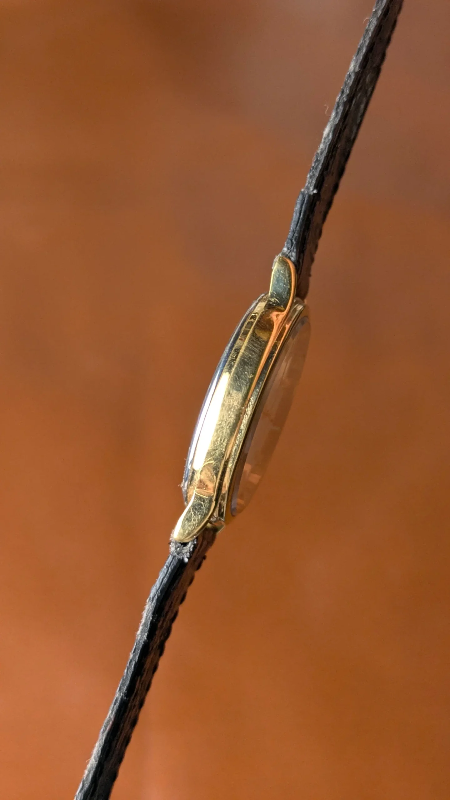 The watch features a clean, minimalist dial with simple gold baton markers that create a refined and balanced appearance. The slim gold case enhances its dress watch aesthetic, giving it a timeless look that remains stylish even decades later.