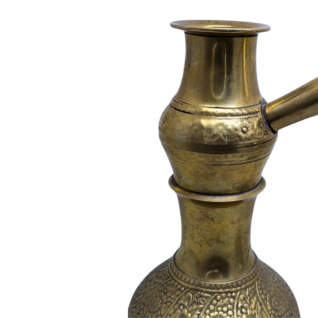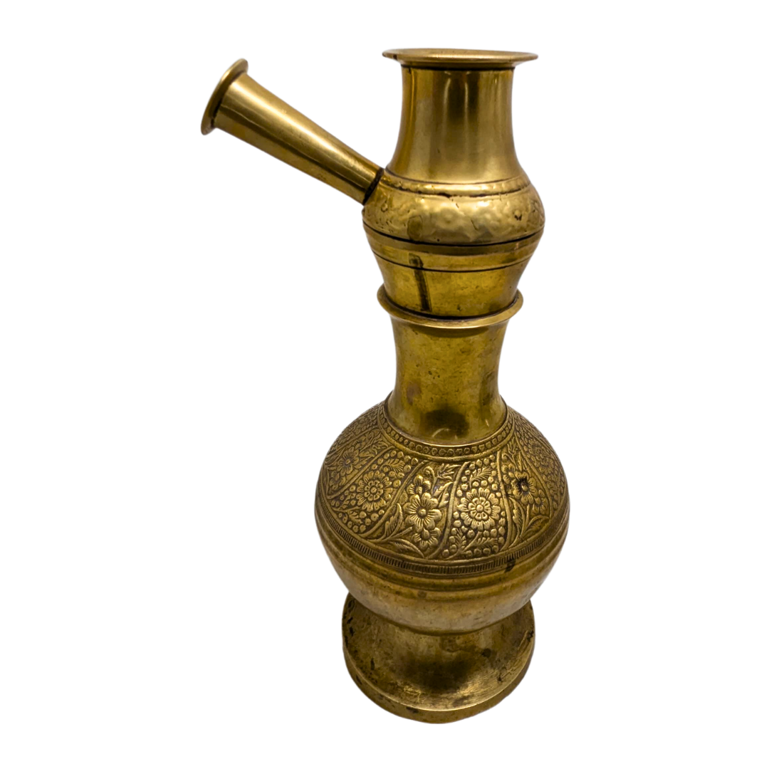 This vintage brass hookah base is a fine example of traditional metal craftsmanship, featuring elegant hand-engraved floral patterns on the lower body. The warm aged brass tone, natural patina, and visible signs of handwork confirm its vintage character and authenticity.