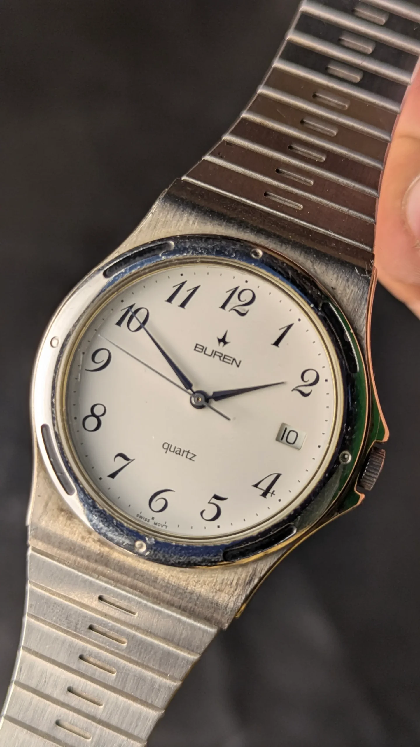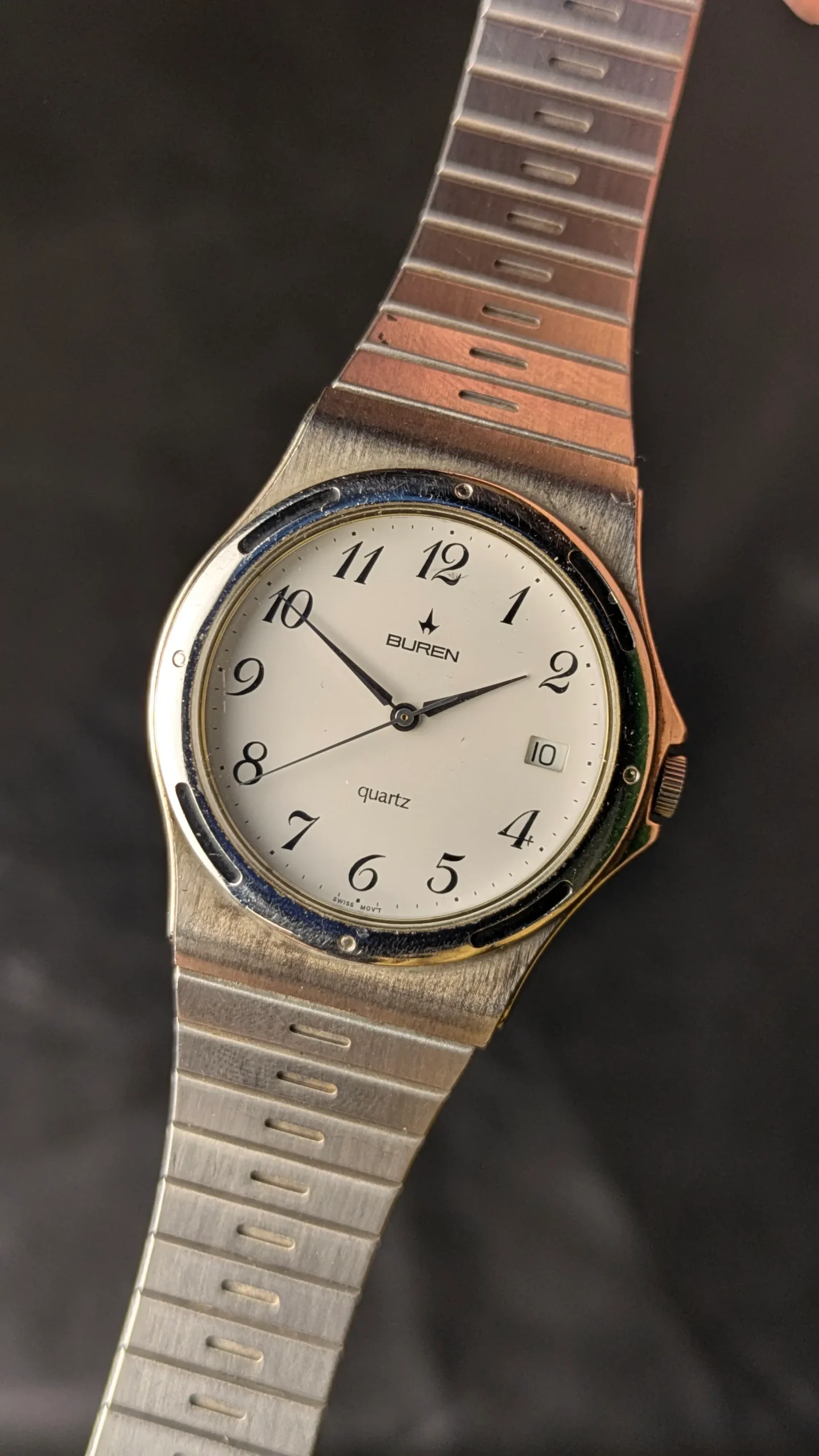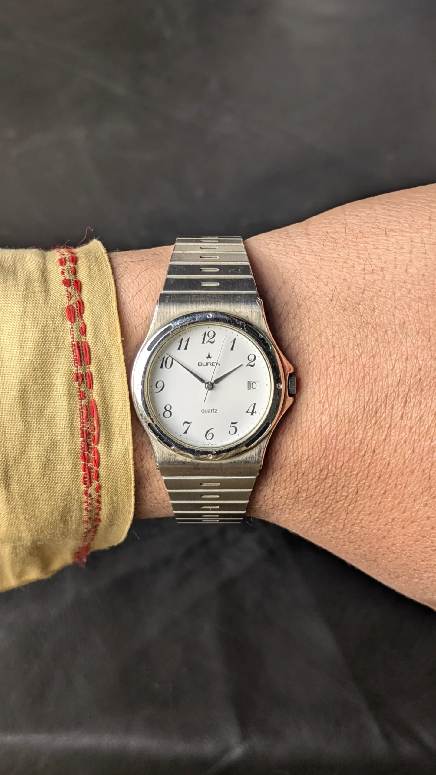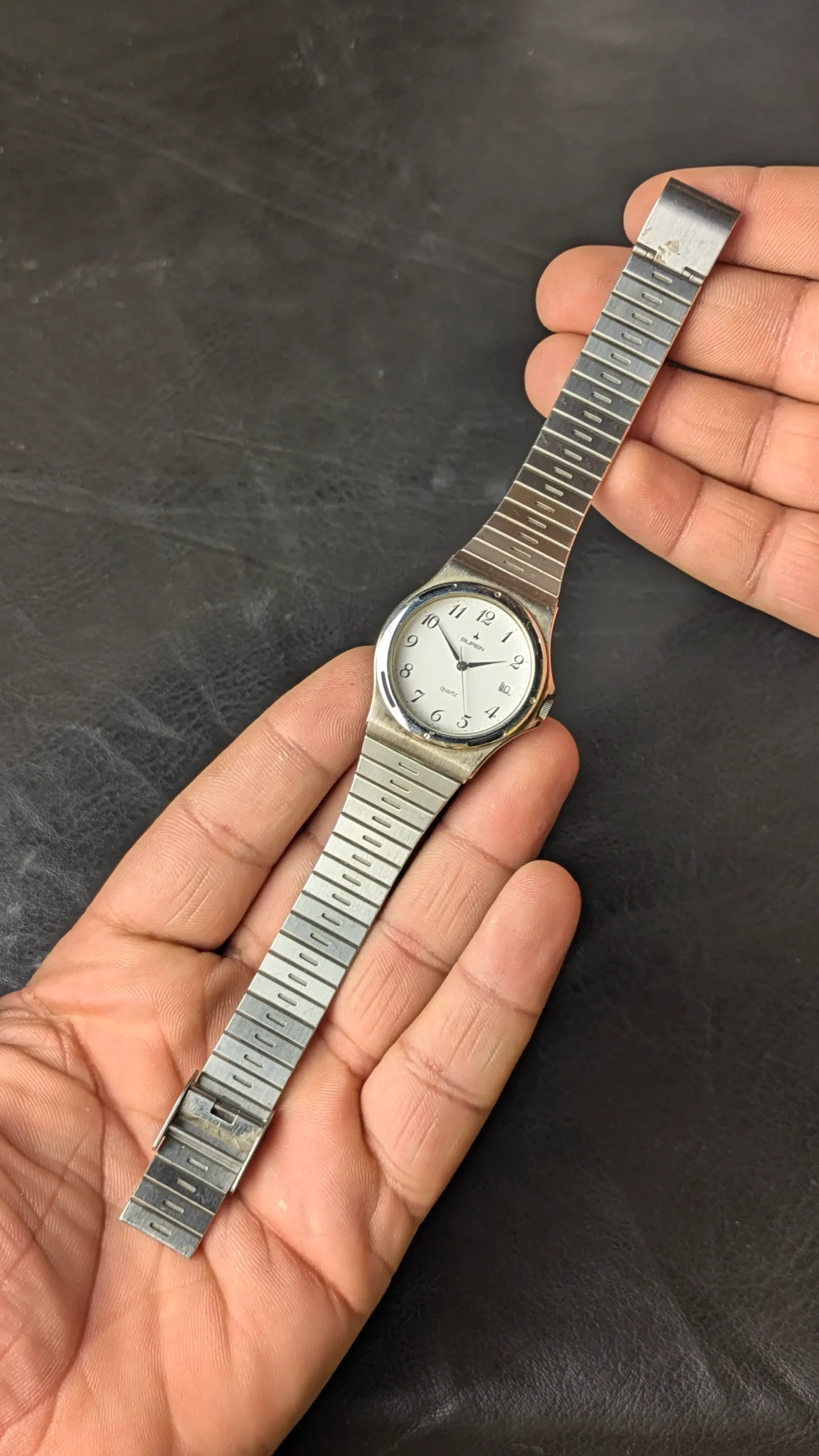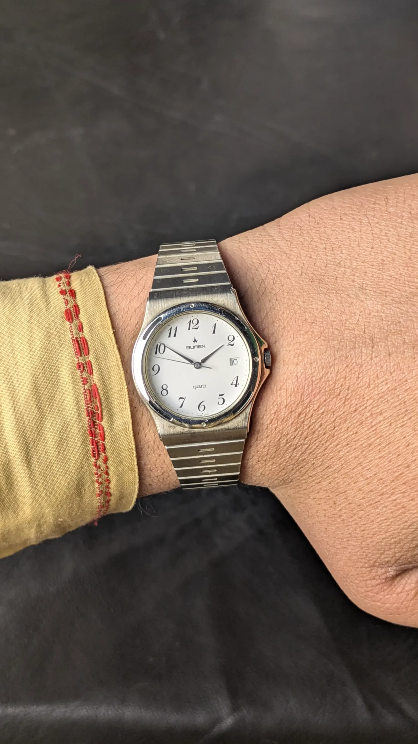 This vintage Buren quartz wristwatch represents the clean and practical design style often seen in Swiss watches of the late 20th century. Buren was a respected Swiss watch brand known for producing reliable and well-crafted timepieces.