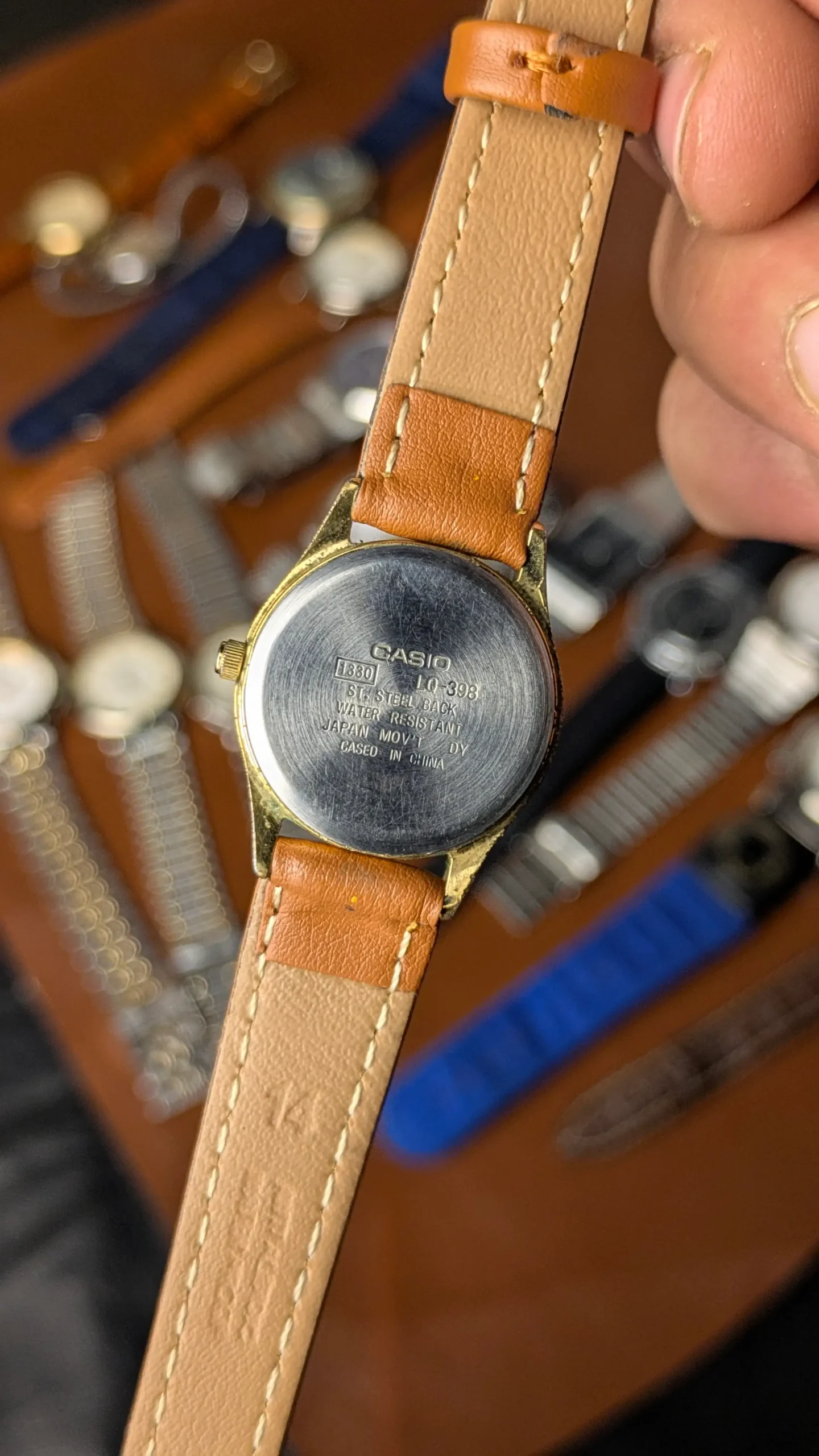 The stainless steel case back confirms its authenticity, featuring model details including LQ-398, water resistance, and Japan movement. Its slim profile and lightweight design make it perfect for daily wear, whether styled with casual outfits or more refined attire.