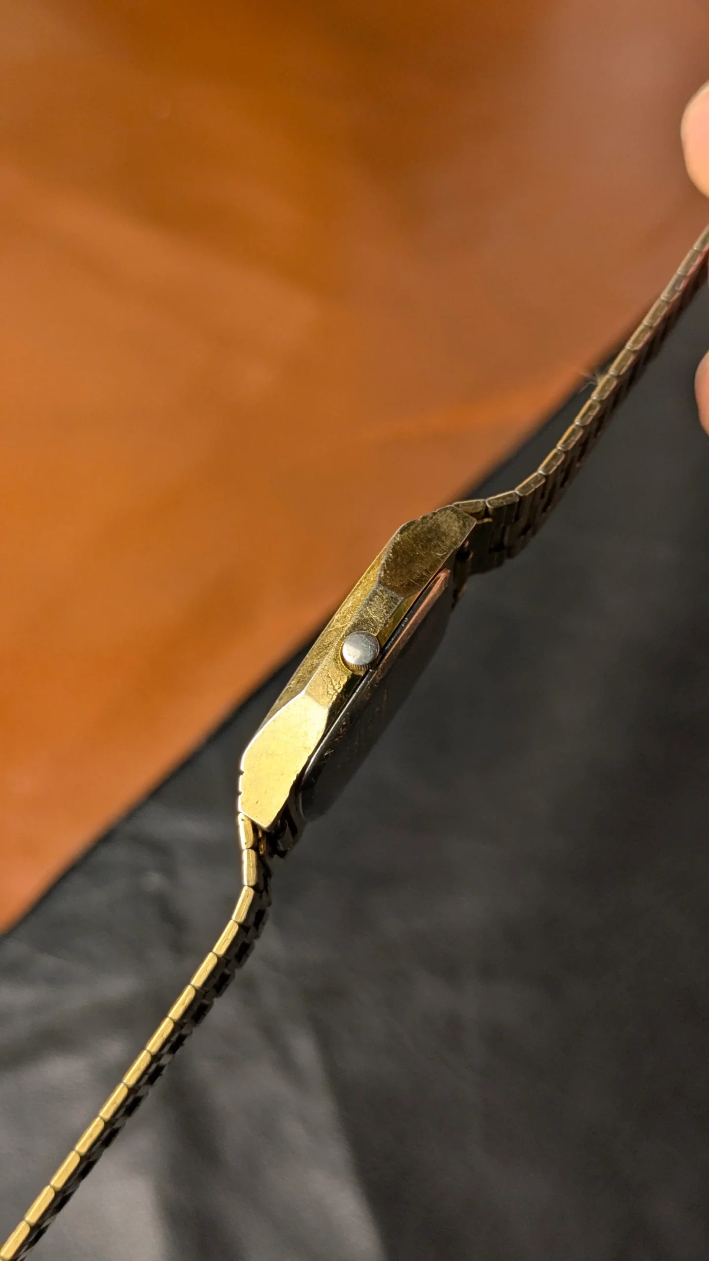The dial has a clean layout with simple hour markers, giving it a minimal and classic vintage appeal. The gold-tone case shows natural signs of aging, adding character and authenticity to the piece.