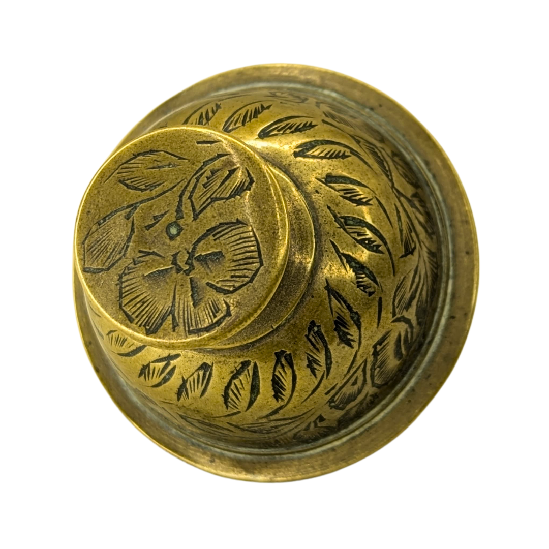 This vintage brass bell is a beautifully crafted traditional piece made from solid brass and decorated with fine hand-engraved floral patterns. Its classic shape and aged patina reflect traditional metal craftsmanship, making it both a functional bell and a decorative antique object.
