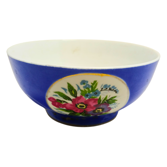 The bowl features a classic rounded shape with a raised footed base, giving it both elegance and stability. The floral artwork—painted in soft pinks, blues, greens, and black accents—creates a striking contrast against the rich blue glaze. Each brushstroke shows careful handwork, making this bowl more than just an object; it is a piece of decorative art with history.