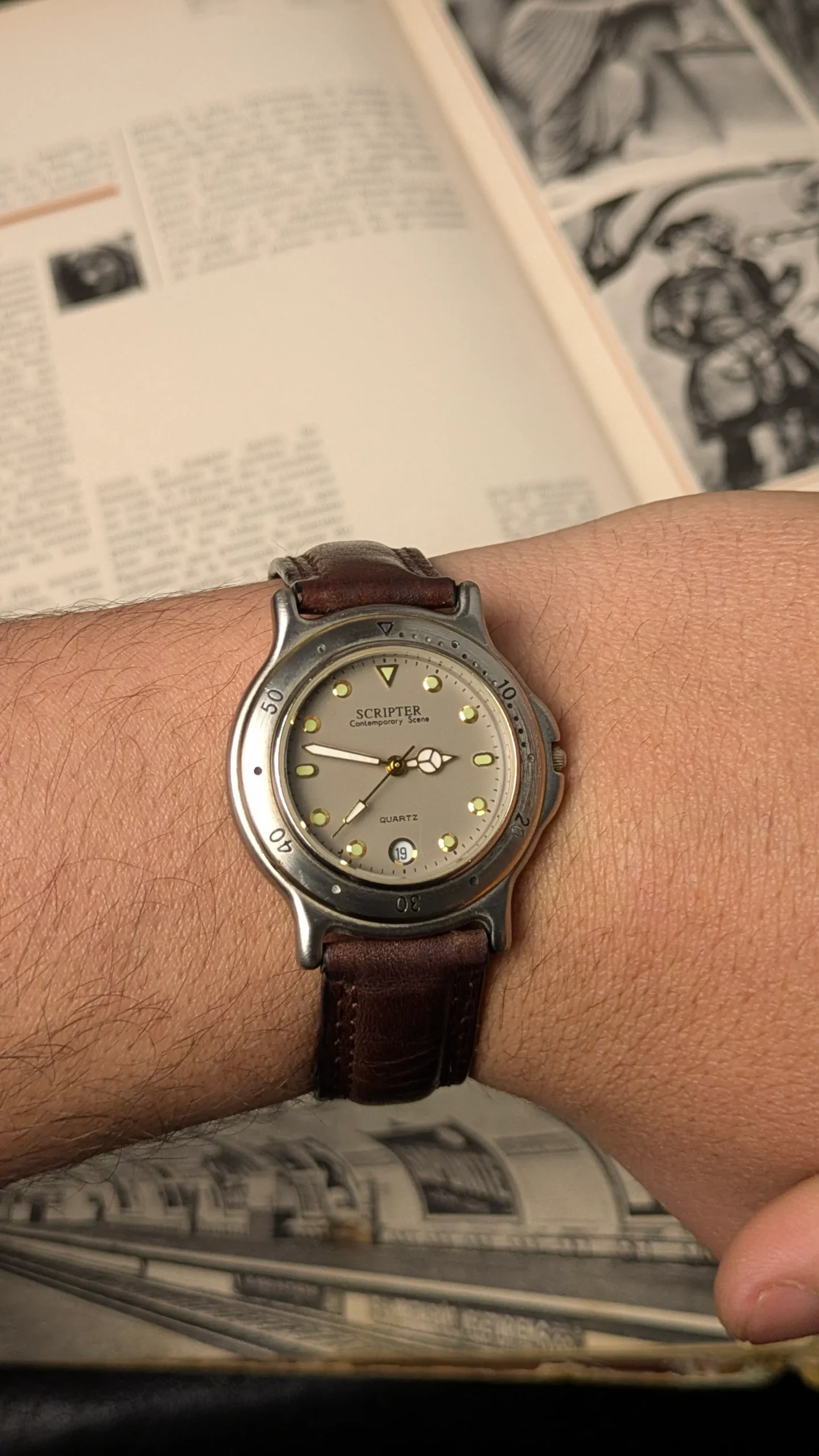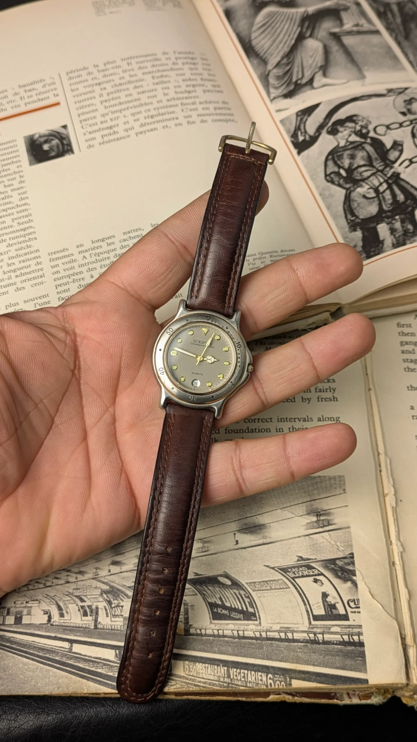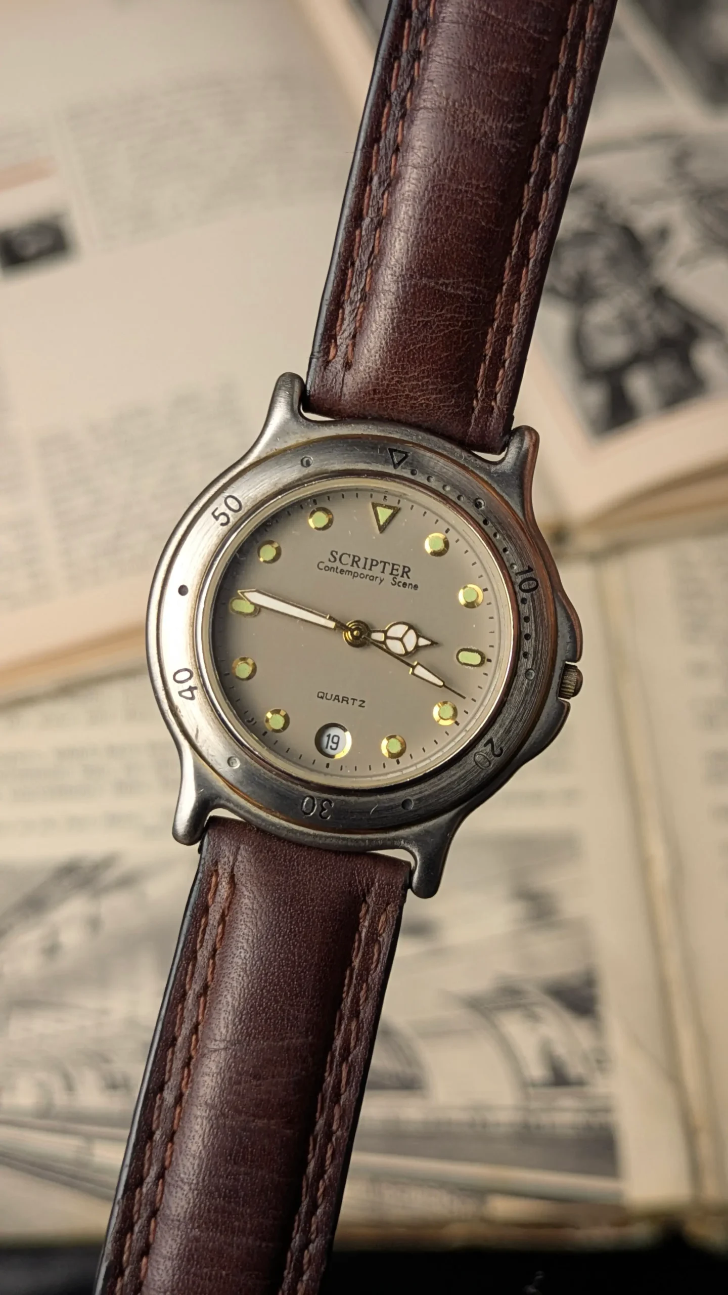 Vintage JAXIS Scripter Quartz Watch – Contemporary Scene Dial, Date Window, Leather Strap (Ref. 20/520-W)