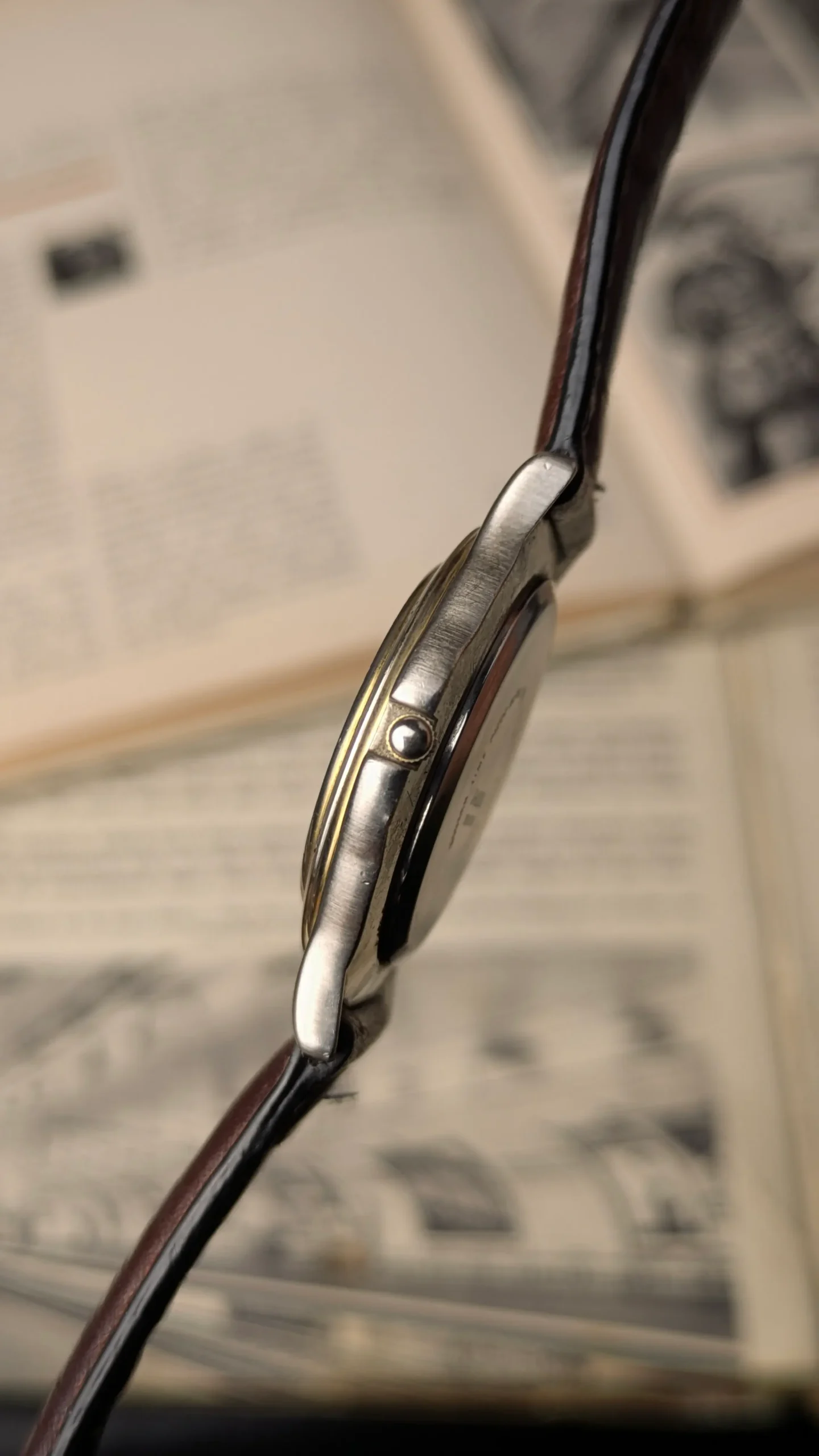 It is paired with a brown leather strap, which complements the vintage tone of the case and enhances overall comfort for daily wear.