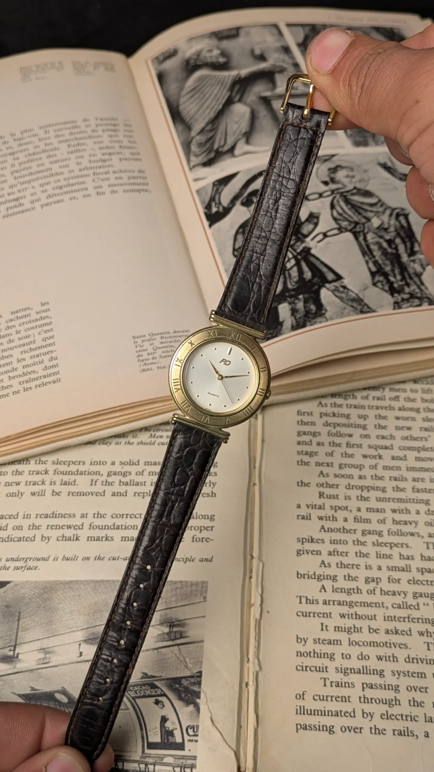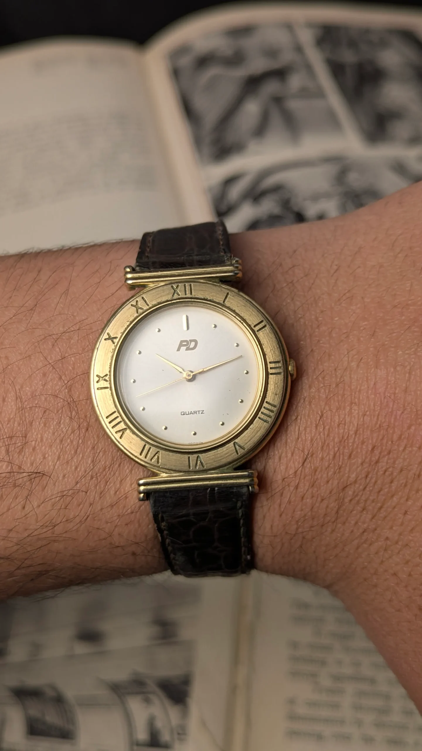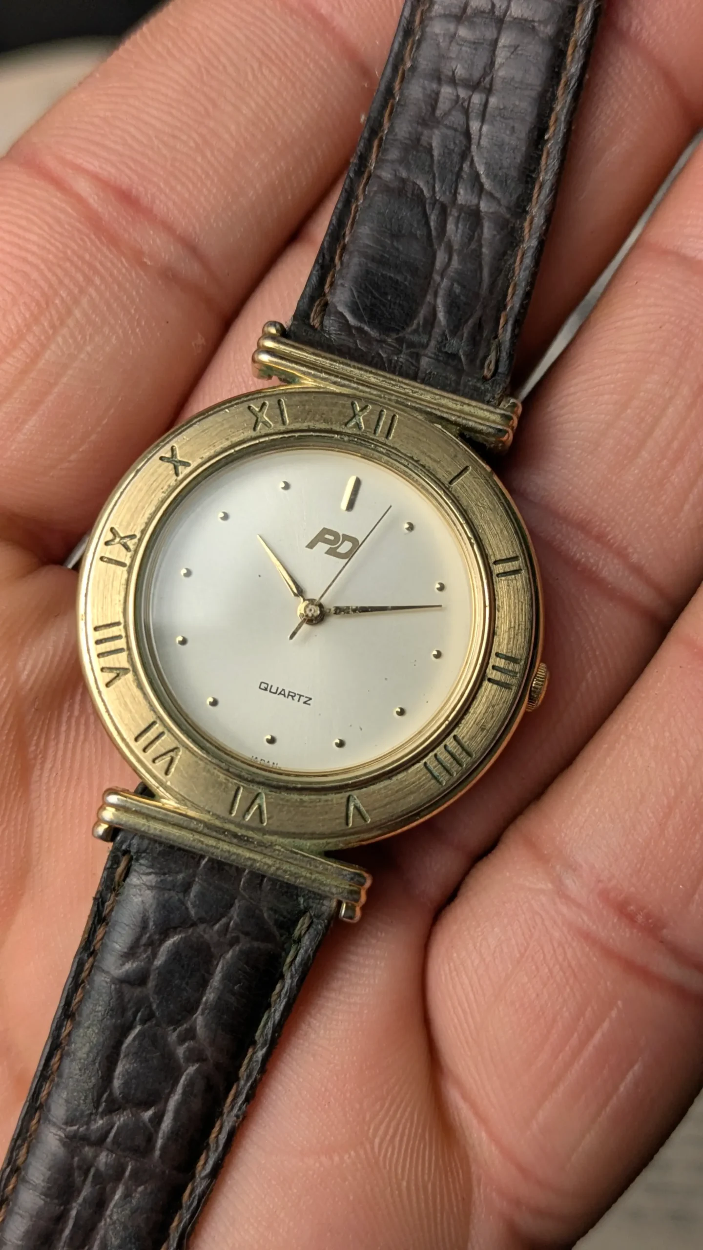 This vintage PD quartz wristwatch features a classic and elegant design typical of Japanese quartz watches produced during the late 1980s to early 1990s. The watch combines a clean dress style with a distinctive engraved bezel, making it an attractive piece for collectors or everyday vintage watch enthusiasts.