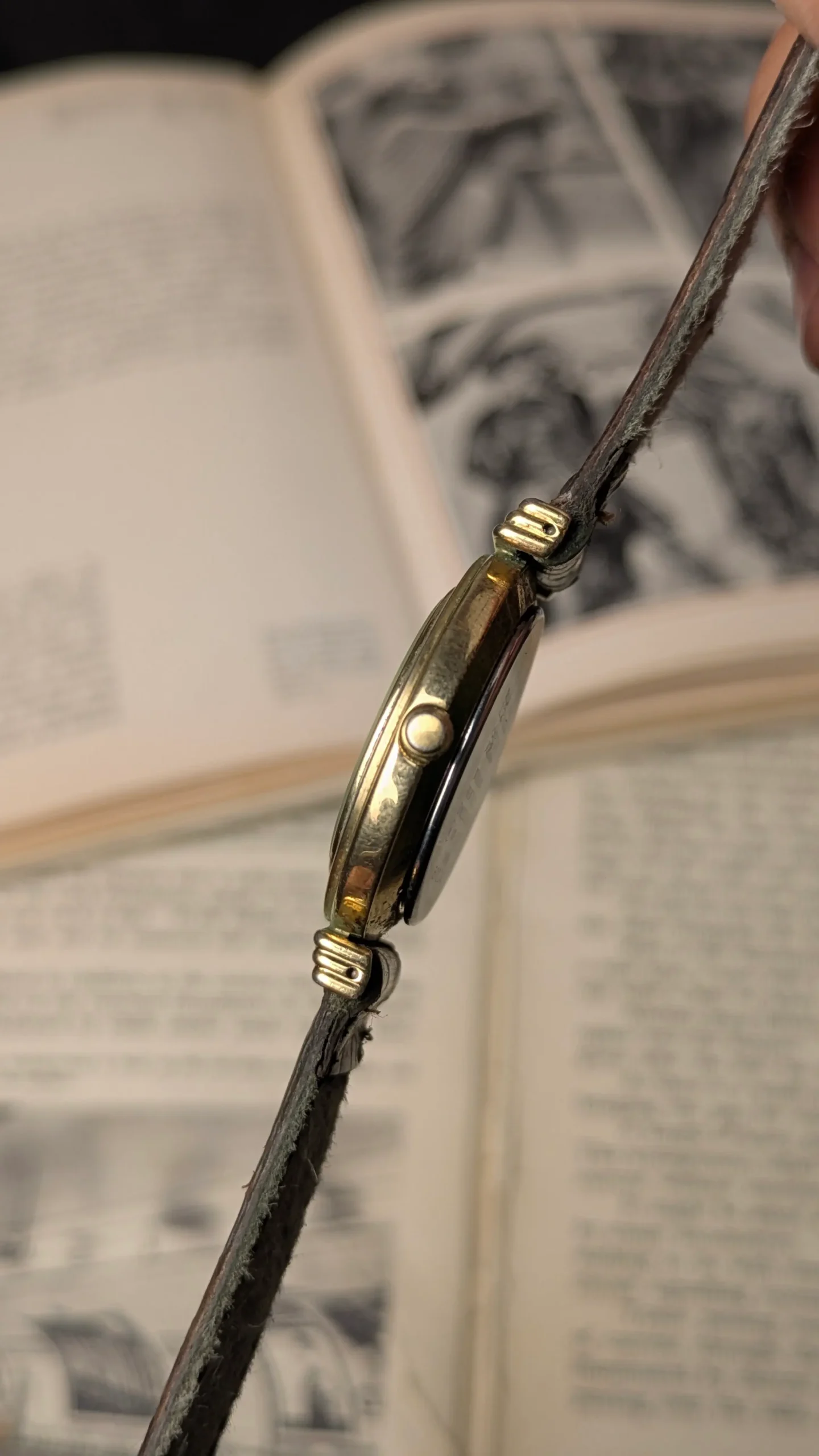 The watch is paired with a brown leather strap, which complements the gold-tone case and maintains the classic vintage aesthetic.