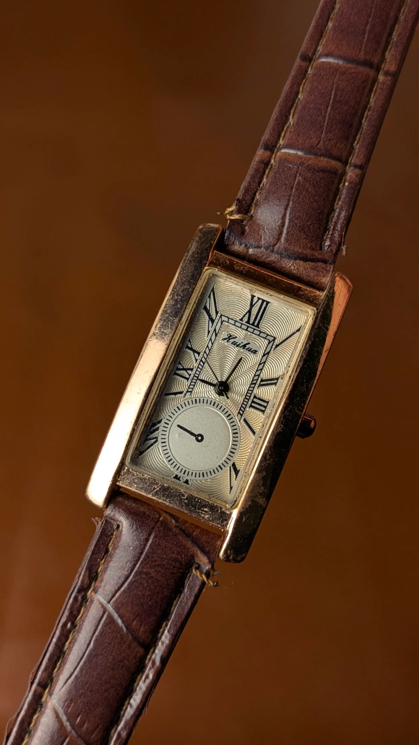 This vintage rectangular gold-tone watch is a timeless piece designed for those who appreciate classic elegance. Featuring a beautifully detailed dial with Roman numerals and a subtle textured pattern, this watch reflects a refined vintage style.