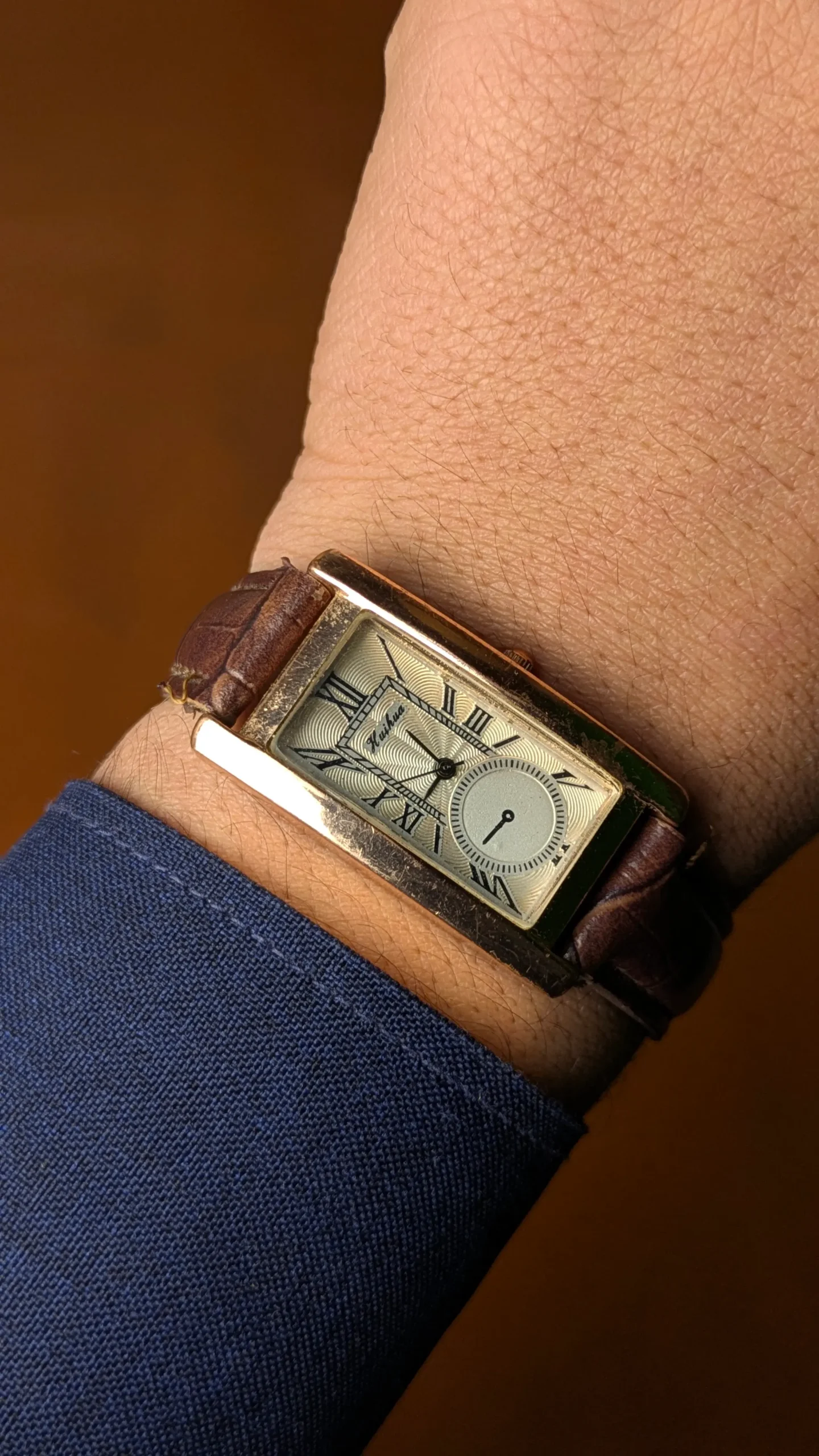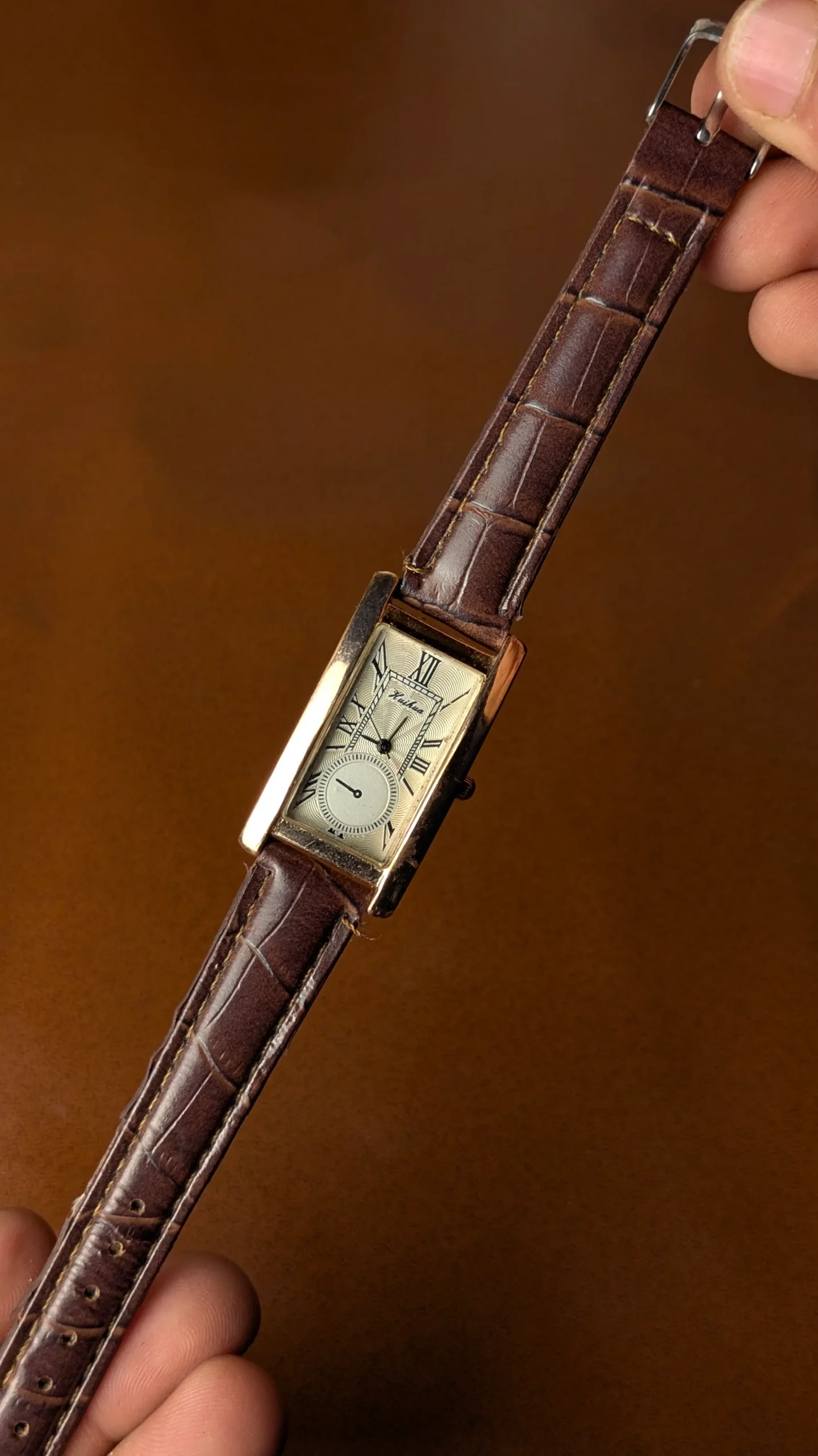 The rectangular case gives it a unique and sophisticated look, making it stand out from ordinary round watches. The small seconds subdial adds a traditional touch, enhancing its antique-inspired design.