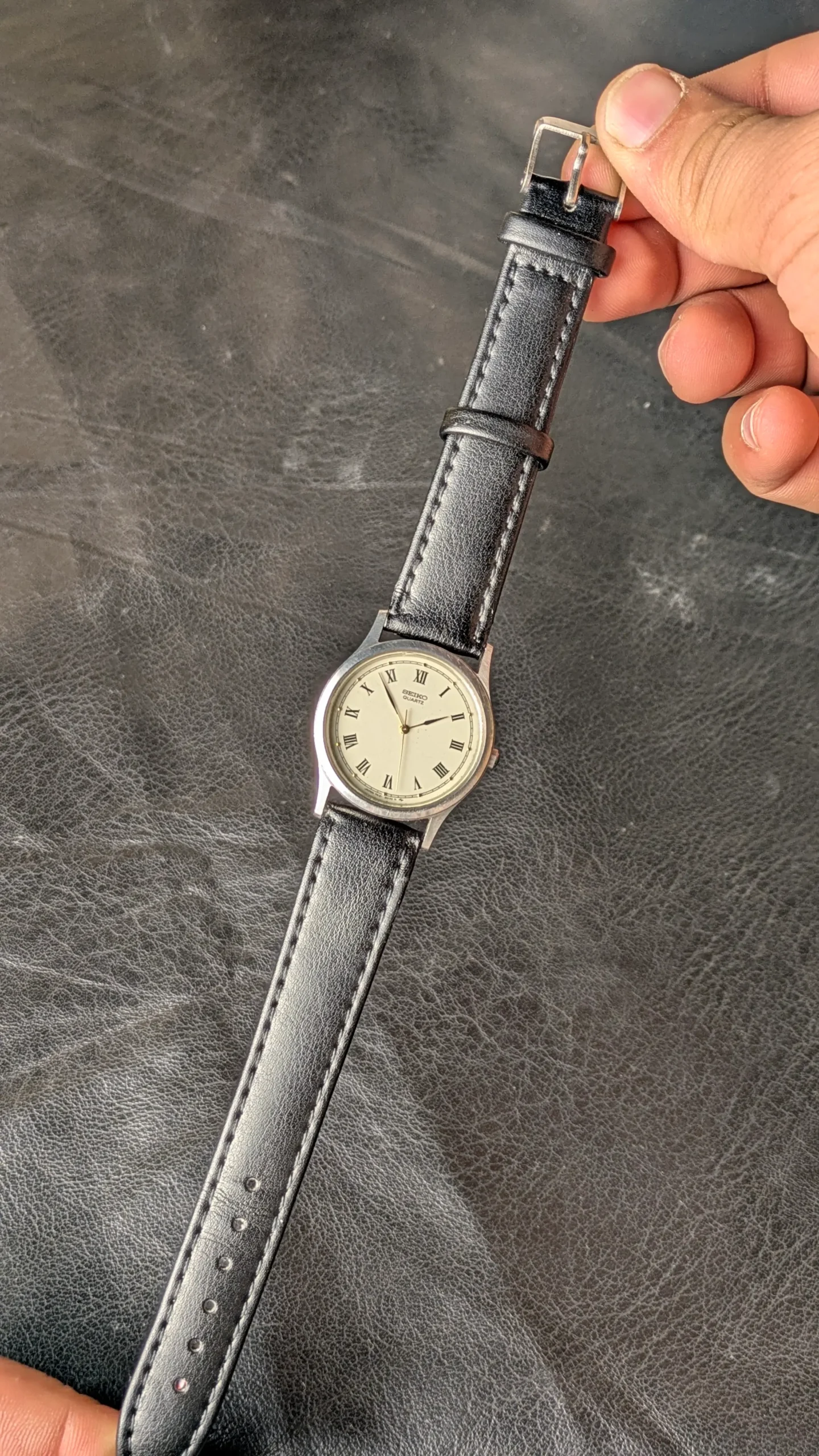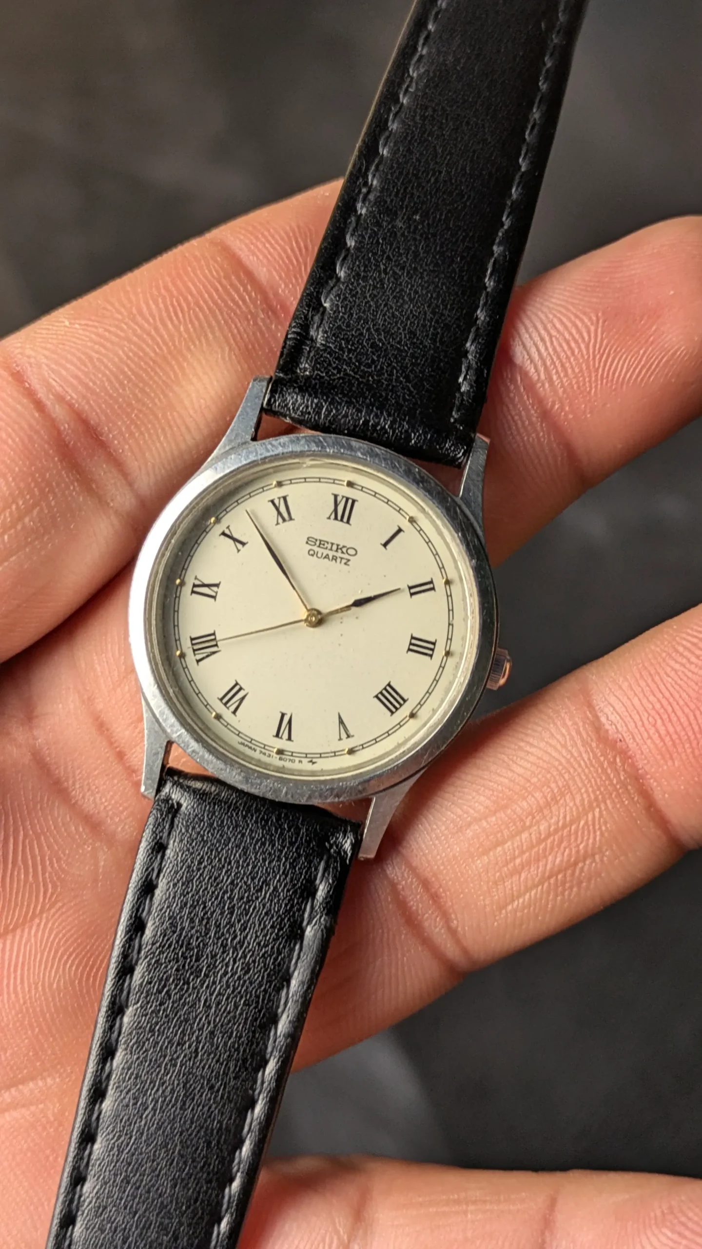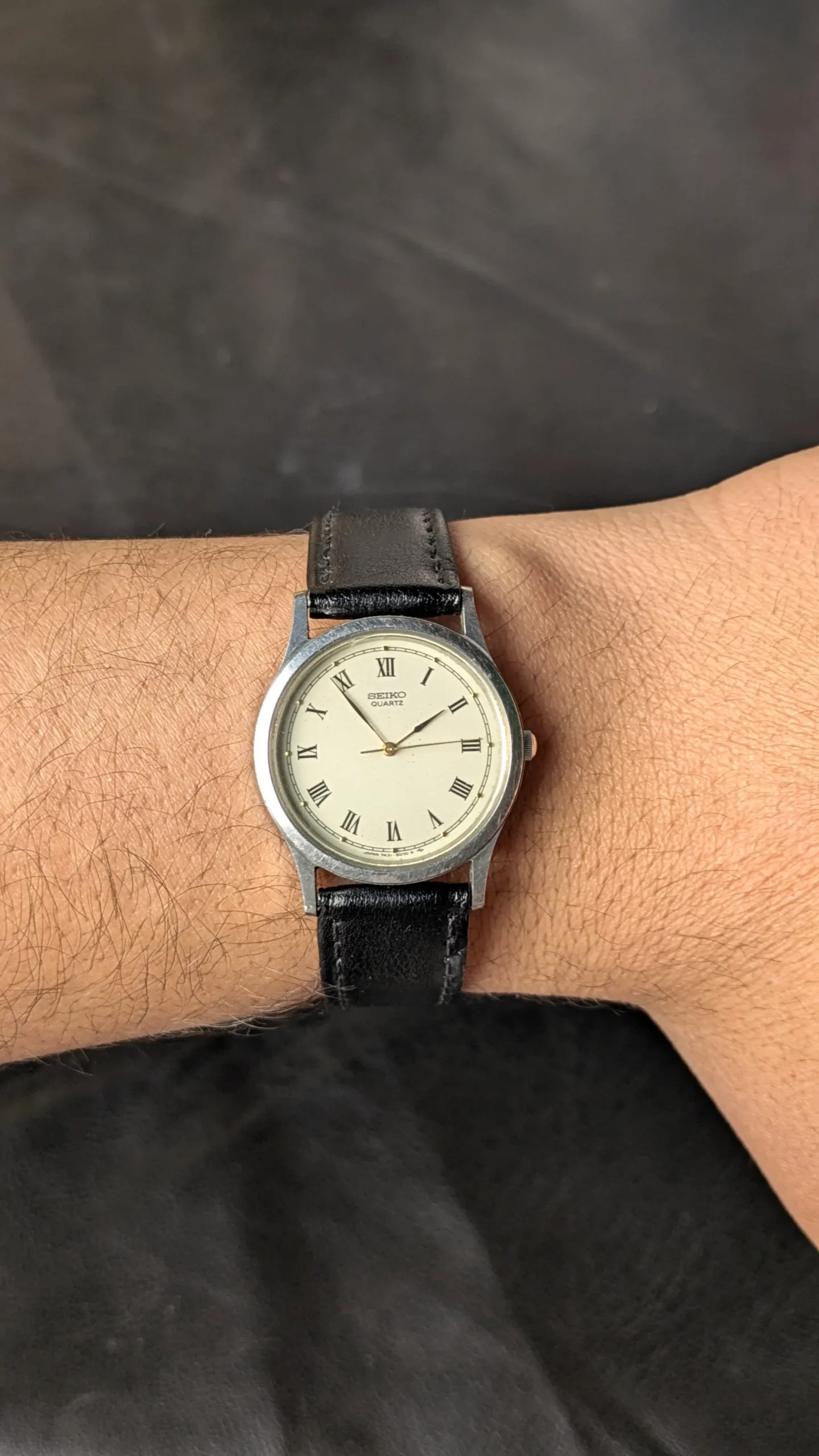 This Seiko quartz wristwatch reflects the clean and refined design philosophy for which Seiko is well known. The watch features a classic ivory dial with Roman numeral hour markers, creating an elegant and traditional appearance.