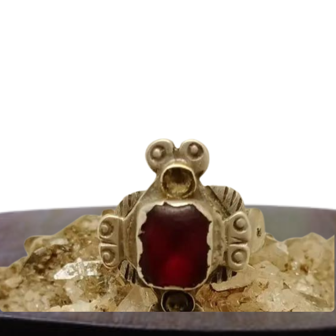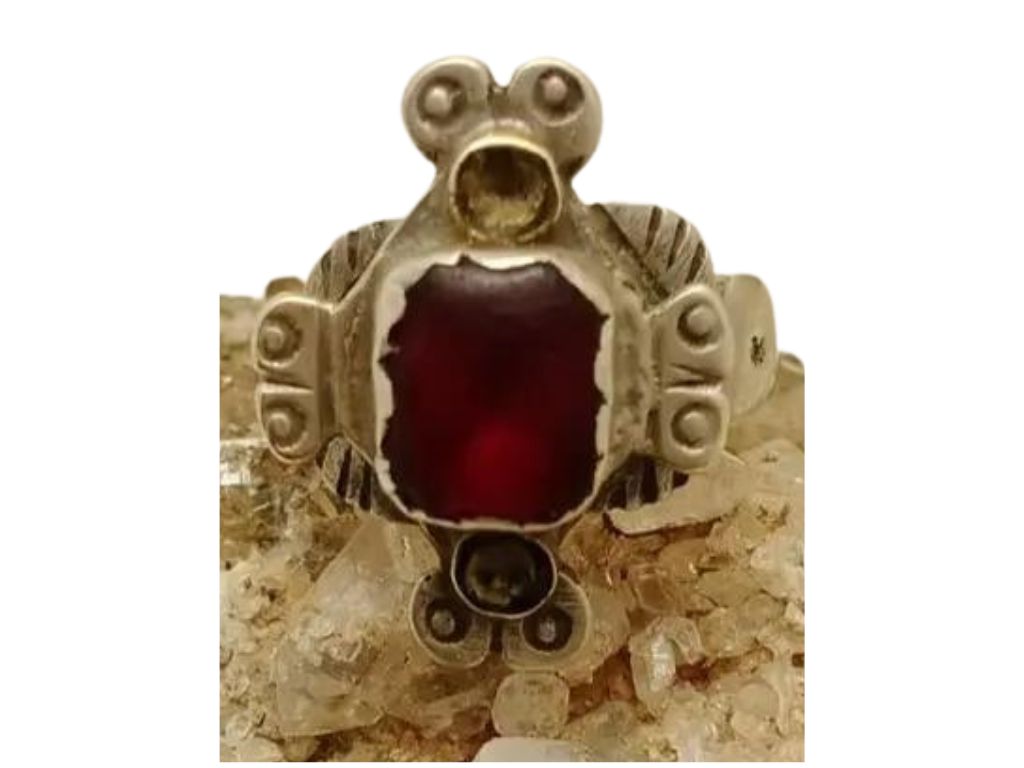 This vintage silver ring with a red stone is a bold and eye-catching piece, made for those who appreciate character, craftsmanship, and timeless style. The ring features a rich, dark red stone set in a solid silver frame with strong tribal and traditional detailing on all sides.