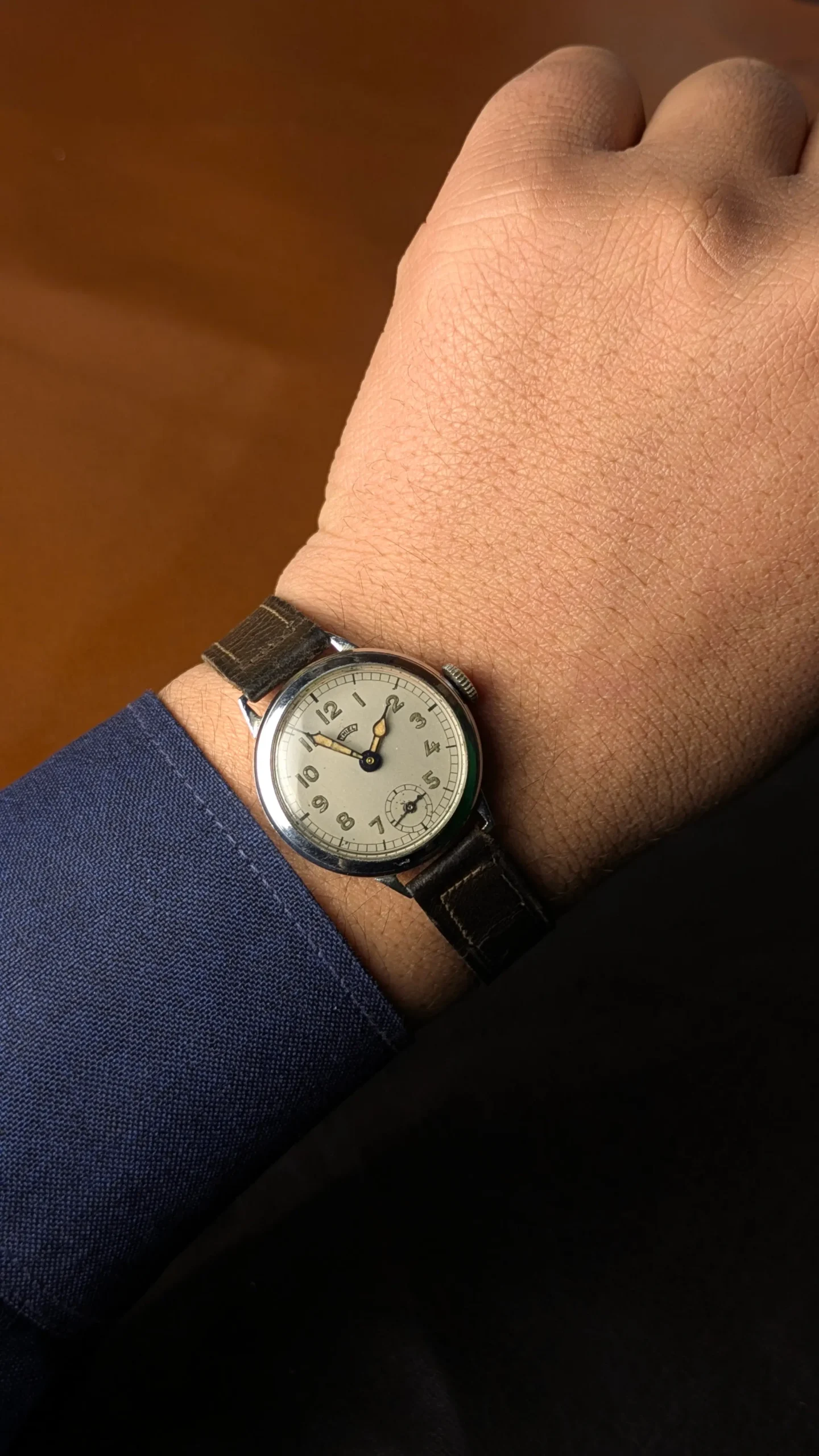 Designed in a time when watches were made for reliability and function, this piece features a clean Arabic dial, small seconds subdial, and a simple yet purposeful layout — all hallmarks of wartime design.
